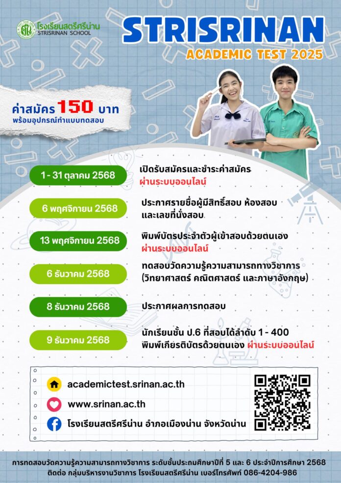 ด้วยโรงเรียนสตรีศรีน่าน ได้จัดทดสอบวัดความรู้ความสามารถทางวิชาการ สำหรับนักเรียนที่กำลังศึกษาอยู่ในระดับชั้นประถมศึกษาปีที่ 5 และ 6 ในวันเสาร์ที่ 6 ธันวาคม พ.ศ. 2568 เวลา 09.00 – 14.30 น. ณ โรงเรียนสตรีศรีน่าน เพื่อเป็นการเปิดโอกาสให้นักเรียนระดับชั้นประถมศึกษาปีที่ 5 และ 6 ในจังหวัดน่าน