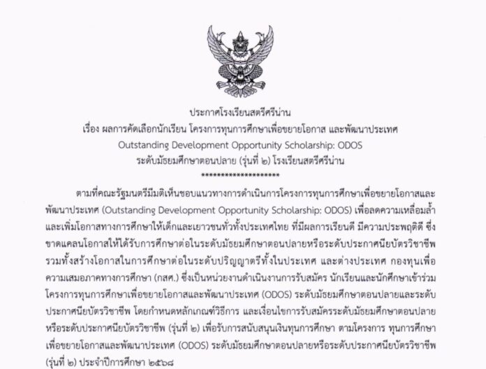 ประกาศ เรื่อง ผลการคัดเลือกนักเรียน โครงการทุนการศึกษาเพื่อขยายโอกาส และพัฒนาประเทศ Outstanding Development Opportunity Scholarship: ODOS ระดับมัธยมศึกษาตอนปลาย (รุ่นที่ ๒) โรงเรียนสตรีศรีน่าน