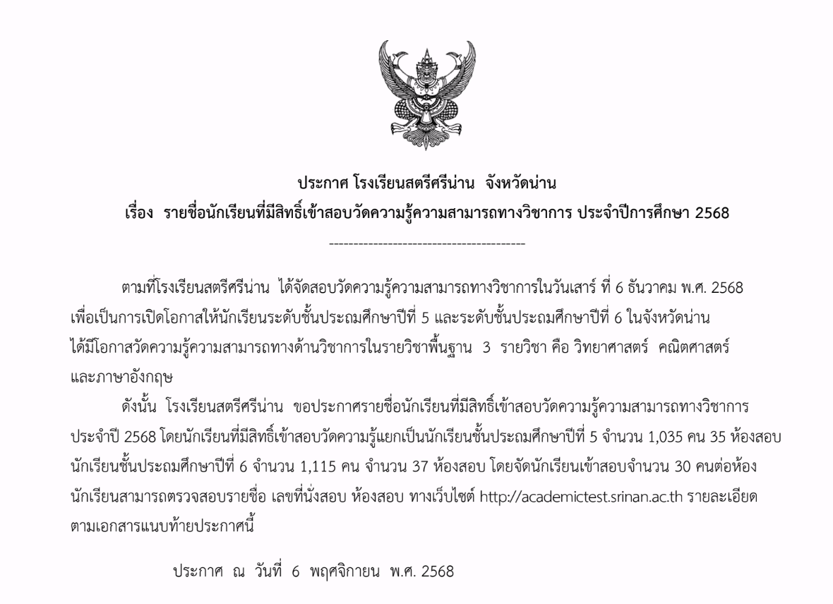 ตามที่โรงเรียนสตรีศรีน่าน ได้จัดสอบวัดความรู้ความสามารถทางวิชาการในวันเสาร์ ที่ 6 ธันวาคม พ.ศ. 2568 เพื่อเป็นการเปิดโอกาสให้นักเรียนระดับชั้นประถมศึกษาปีที่ 5 และระดับชั้นประถมศึกษาปีที่ 6 ในจังหวัดน่าน ได้มีโอกาสวัดความรู้ความสามารถทางด้านวิชาการในรายวิชาพื้นฐาน 3 รายวิชา คือ วิทยาศาสตร์ คณิตศาสตร์ และภาษาอังกฤษ