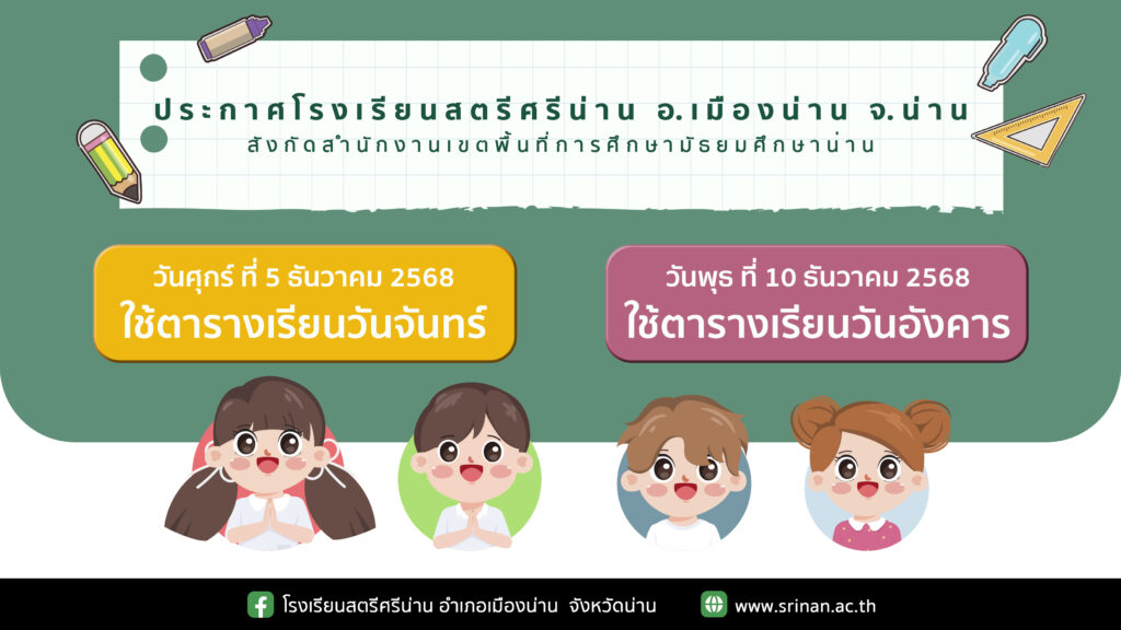 ในการนี้โรงเรียนสตรีศรีน่าน ได้กำหนดให้หยุดการเรียนการสอนในระหว่างวันที่ ๒๙ – ๓๐ ธันวาคม พ.ศ. ๒๕๖๘ ทั้งนี้ได้มีการเรียนการสอนชดเชยในวันศุกร์ที่ ๕ ธันวาคม พ.ศ. ๒๕๖๘ (ใช้ตารางเรียนวันจันทร์) และวันพุธที่ ๑๐ ธันวาคม พ.ศ. ๒๕๖๘ (ใช้ตารางเรียนวันอังคาร) และเปิดทำการเรียนการสอนในวันจันทร์ที่ ๕ มกราคม พ.ศ. ๒๕๖๙ โดยนักเรียนและผู้ปกครองสามารถติดตามข่าวสารประชาสัมพันธ์ เพิ่มเติมได้ทางเว็บไซต์ของโรงเรียน www.sinan.ac.th