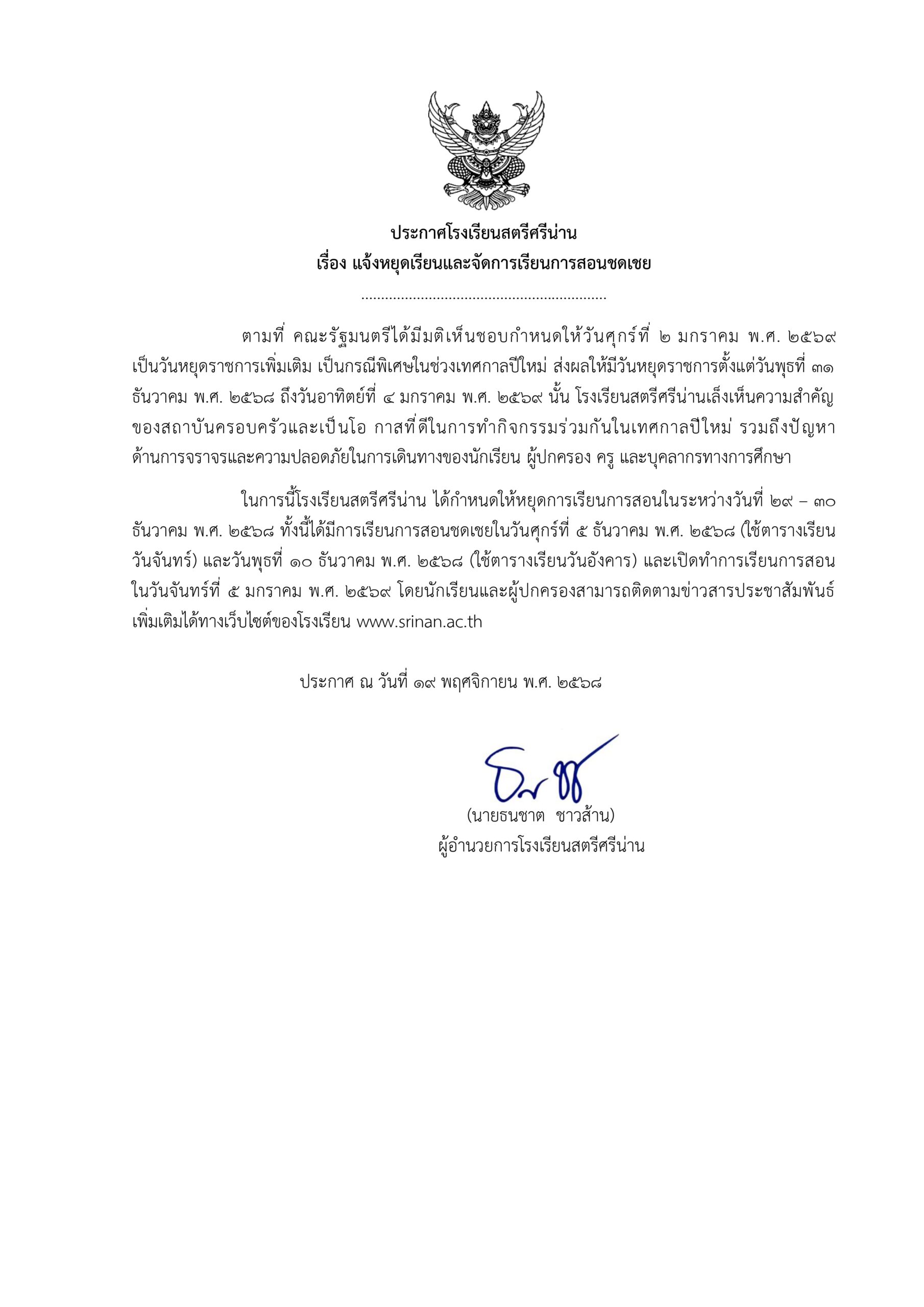 ประกาศโรงเรียนสตรีศรีน่าน เรื่อง แจ้งหยุดเรียนและจัดการเรียนการสอนชดเชย