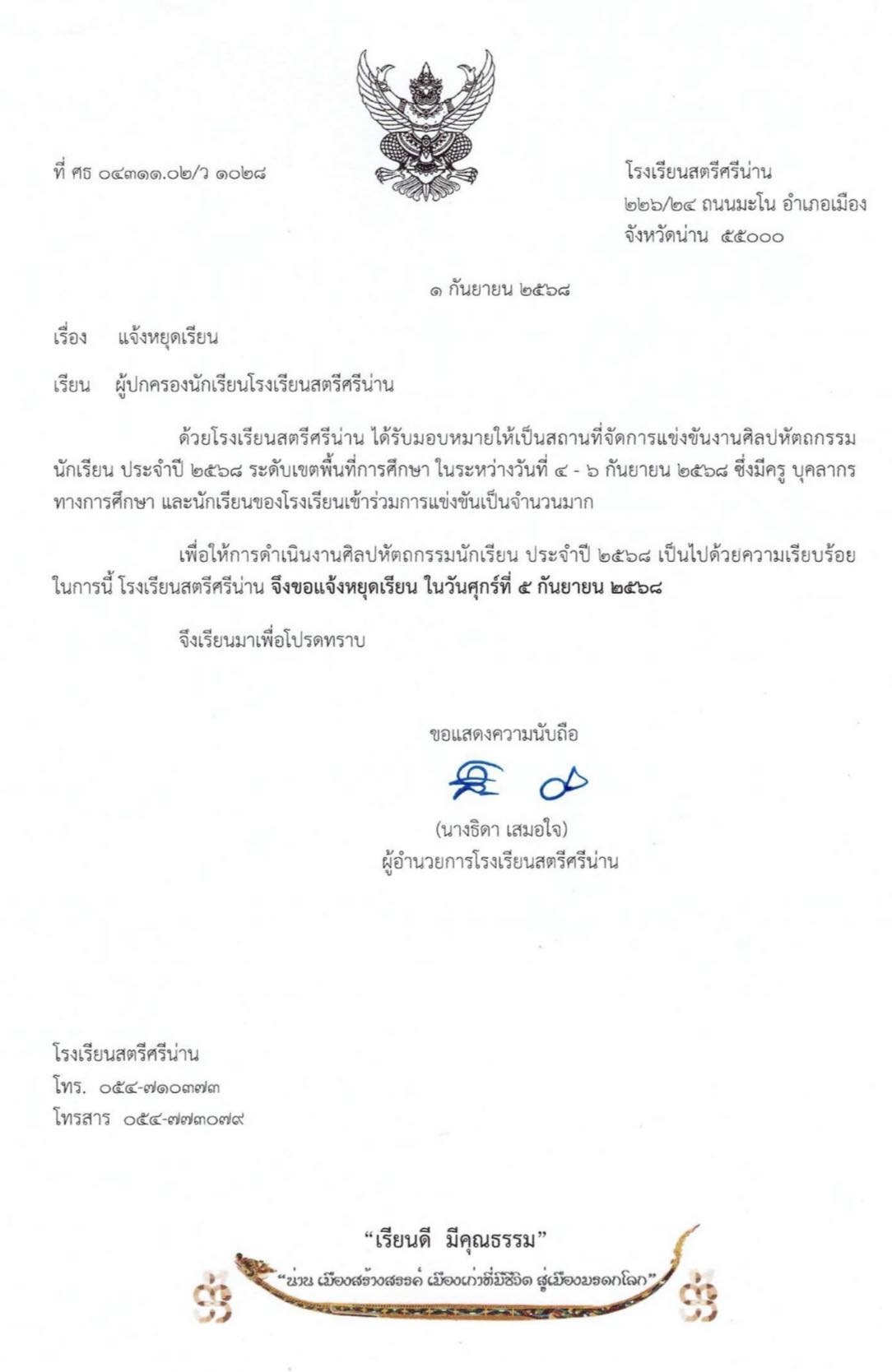 เพื่อให้การดำเนินงานศิลปหัตถกรรมนักเรียน ประจำปี 2568 เป็นไปด้วยความเรียบร้อยในการนี้ โรงเรียนสตรีศรีน่าน จึงขอแจ้งหยุดเรียน ในวันศุกร์ที่ 5 กันยายน 2568