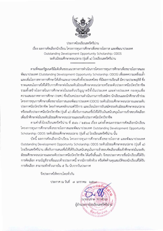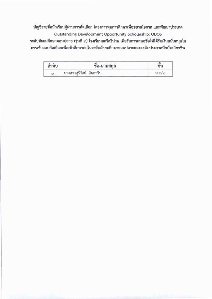 ประกาศ เรื่อง ผลการคัดเลือกนักเรียน โครงการทุนการศึกษาเพื่อขยายโอกาส และพัฒนาประเทศ Outstanding Development Opportunity Scholarship: ODOS ระดับมัธยมศึกษาตอนปลาย (รุ่นที่ ๔) โรงเรียนสตรีศรีน่าน เพื่อรับการเสนอชื่อให้ได้รับเงินสนับสนุนในการเข้าสอบคัดเลือกเพื่อเข้าศึกษาต่อในระดับมัธยมศึกษาตอนปลายและระดับประกาศนียบัตรวิชาชีพ