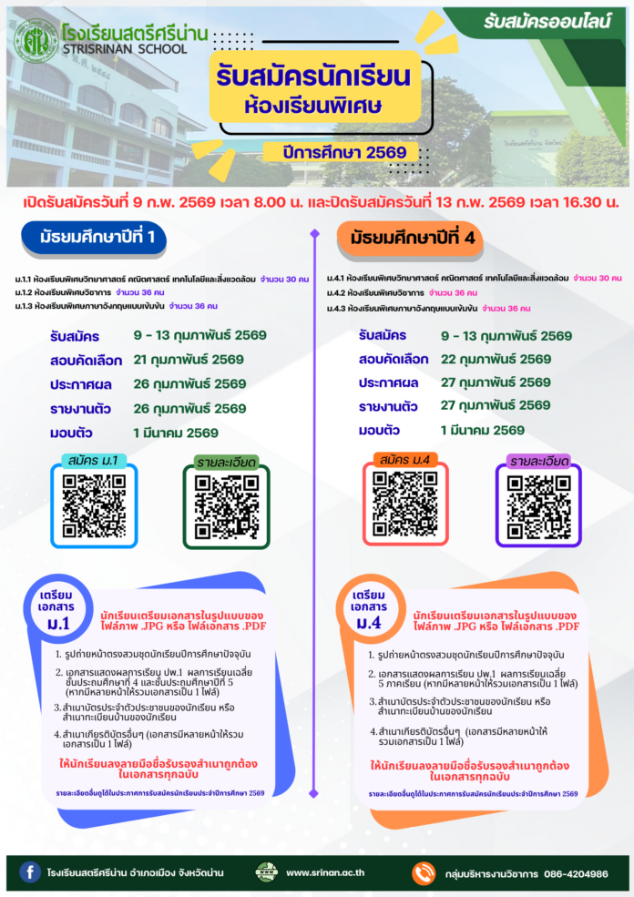โรงเรียนสตรีศรีน่าน รับสมัครนักเรียนห้องเรียนพิเศษ ระดับมัธยมศึกษาปีที่ 1 และ 4 ปีการศึกษา 2569