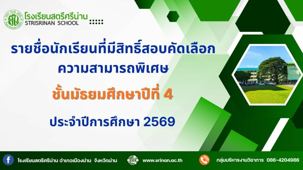 ตามที่ โรงเรียนสตรีศรีน่าน ได้ดำเนินการรับสมัครนักเรียนเพื่อเข้าเรียนในระดับชั้นมัธยมศึกษาปีที่ 1 และ 4 ประจำปีการศึกษา 2569 โดยรับสมัครนักเรียนที่มีความสามารถพิเศษ ในวันที่ 19 – 20 มีนาคม 2569 เรียบร้อยแล้วนั้น โรงเรียนสตรีศรีน่าน จึงขอประกาศรายชื่อนักเรียนที่มีสิทธิ์สอบคัดเลือกความสามารถพิเศษ โดยให้นักเรียนที่มีสิทธิ์สอบคัดเลือกความสามารถพิเศษ ดังมีรายชื่อแนบท้ายประกาศนี้มารายงานตัวและทดสอบภาคปฏิบัติและสัมภาษณ์ รายชื่อและรายละเอียดตามเอกสารแนบท้ายประกาศนี้
