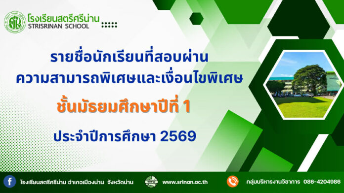 โรงเรียนสตรีศรีน่าน จึงขอประกาศผลการสอบคัดเลือกความสามารถพิเศษด้านต่างๆ โดยมีนักเรียนที่สอบผ่านความสามารถพิเศษด้านวิชาการจำนวน 2 คน ความสามารถพิเศษด้านกีฬา จำนวน 22 คน และนักเรียนเงื่อนไขพิเศษ 4 คน ตามเกณฑ์ประกาศรับสมัครนักเรียนชั้นมัธยมศึกษาปีที่ 1 โรงเรียนสตรีศรีน่าน ประจำปีการศึกษา 2569 และให้นักเรียนที่มีรายชื่อตามประกาศนี้ มารายงานตัวในวันพฤหัสบดีที่ 26 มีนาคม 2569 เวลา 09.00 – 11.00 น. ณ ห้องบริหารวิชาการ อาคารฉลองรัตน์ และเข้าสอบข้อเขียนในวันเสาร์ที่ 28 มีนาคม 2569 เวลา 09.00 – 15.10 น. ตามตารางสอบคัดเลือกนักเรียนชั้นมัธยมศึกษาปีที่ 1 ปีการศึกษา 2569 หากนักเรียนคนใดไม่มารายงานตัวตามวันและเวลาที่โรงเรียนกำหนด จะถือว่าสละสิทธิ์การเข้าเรียน