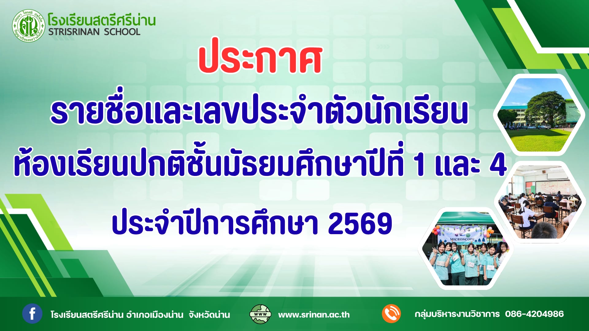 ประกาศ เรื่อง รายชื่อและเลขประจำตัวนักเรียนชั้นมัธยมศึกษาปีที่ 1 และ 4 ห้องเรียนปกติ แยกตามห้องเรียน ปีการศึกษา 2569