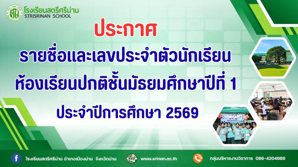 ตามที่ โรงเรียนสตรีศรีน่าน ได้ดำเนินการรับสมัครสอบคัดเลือกนักเรียนและรายงานตัวเพื่อเข้าเรียนในระดับชั้นมัธยมศึกษาปีที่ 1 และ 4 ปีการศึกษา 2569 เรียบร้อยแล้ว เพื่อให้การดำเนินการเป็นไปตามนโยบายและ แนวปฏิบัติการรับนักเรียนของสำนักงานคณะกรรมการการศึกษาขั้นพื้นฐาน โดยให้นักเรียนทุกคนที่มีรายชื่อตามประกาศพร้อมผู้ปกครองมามอบตัวเพื่อเข้าเรียนเป็นนักเรียนโรงเรียนสตรีศรีน่าน ตามวันและเวลาในประกาศ ณ ห้องประชุมศรีเพชรพิกุล นักเรียนแต่งกายชุดนักเรียนโรงเรียนเดิมให้เรียบร้อย เตรียมเอกสารหลักฐานการมอบตัวและค่าใช้จ่ายตามเอกสารที่นักเรียนได้รับในวันรายงานตัว หากนักเรียนไม่มามอบตัวในวันและเวลาดังกล่าวถือว่าสละสิทธิ์การเข้าเรียนโรงเรียนสตรีศรีน่าน