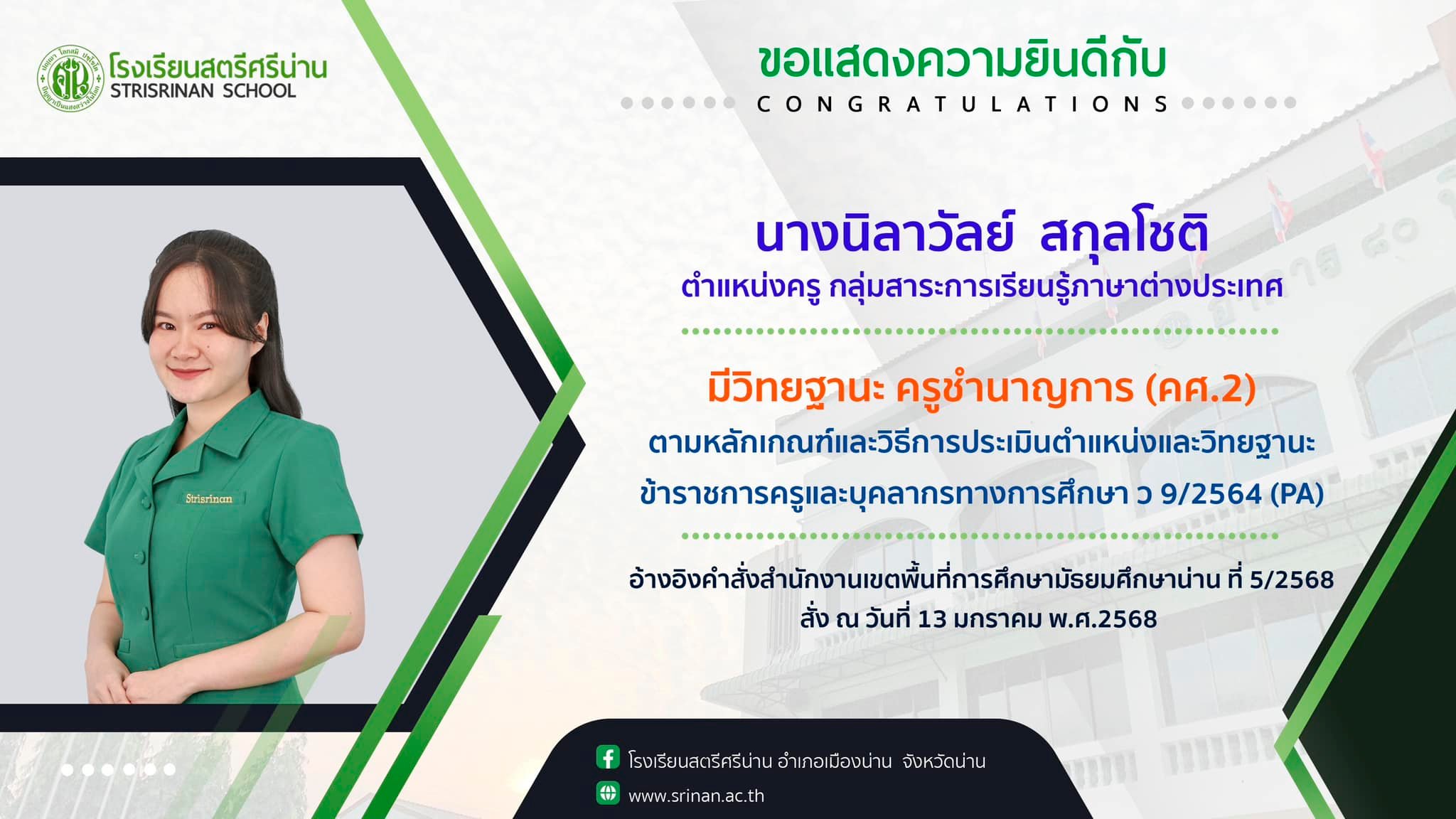 โรงเรียนสตรีศรีน่าน ขอแสดงความยินดีกับคณะครู ที่มีวิทยฐานะ ครูชำนาญการ (คศ.2) ตามหลักเกณฑ์และวิธีการประเมินตำแหน่งและวิทยฐานะ ข้าราชการครูและบุคลากรทางการศึกษา ว 9/2564 (PA) อ้างอิงคำสั่งสำนักงานเขตพื้นที่การศึกษามัธยมศึกษาน่าน ที่ 5/2568 สั่ง ณ วันที่ 13 มกราคม พ.ศ.2568