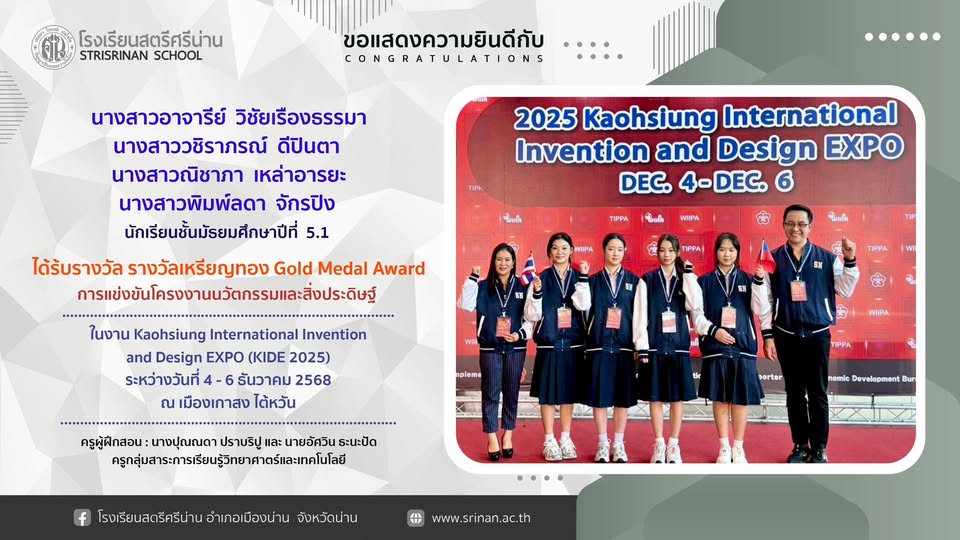 ขอแสดงความยินดีกับนักเรียนที่ได้รับรางวัลเหรียญทอง Gold Medal Award การแข่งขันโครงงานนวัตกรรมและสิ่งประดิษฐ์ ในงาu Kaohsiung International Invention and Design EXPO (KIDE 2025) ระหว่างวันที่ 4 – 6 ธันวาคม 2568 ณ เมืองเกาสง ไต้หวัน
