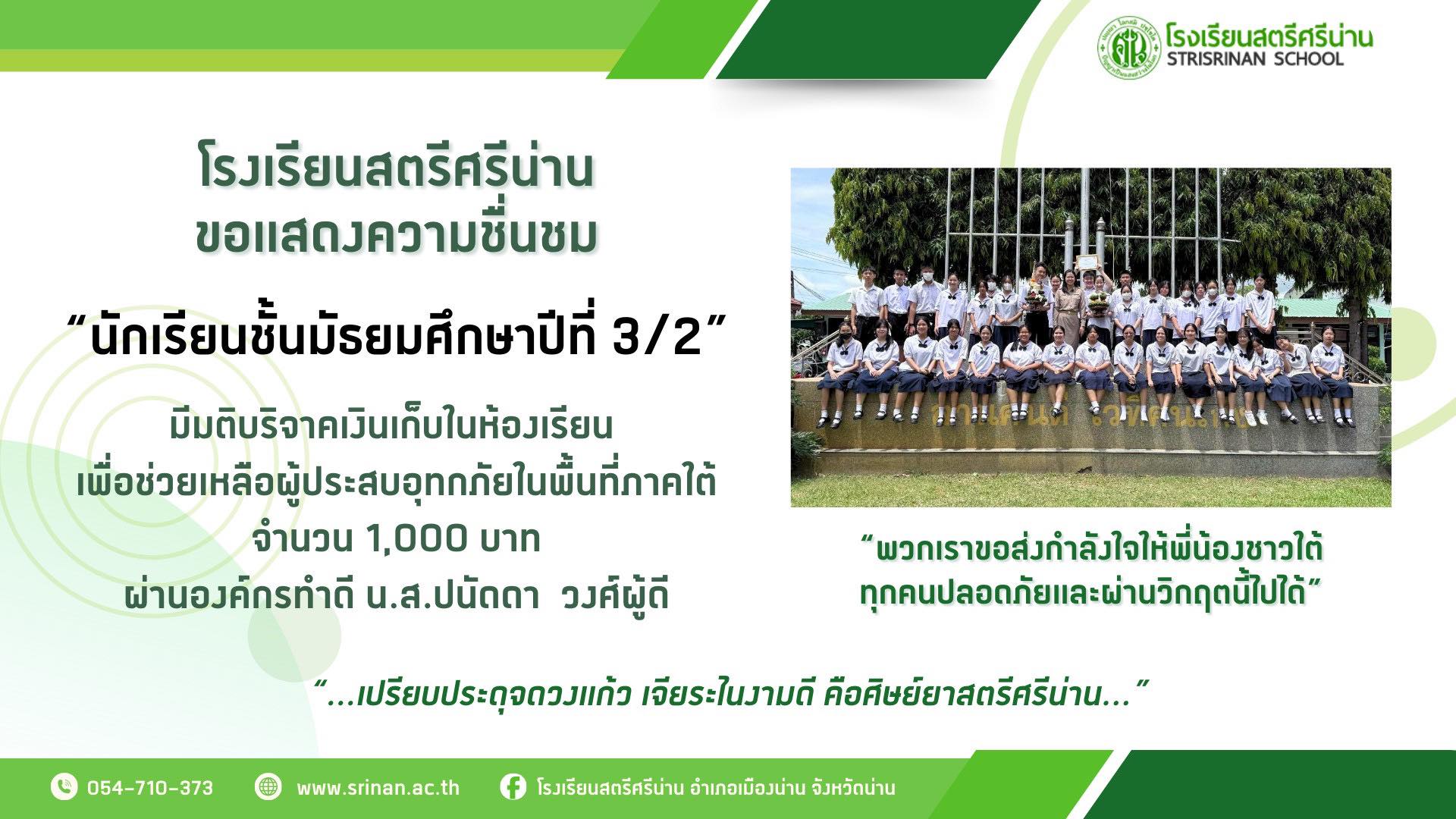 ขอแสดงความชื่นชม นักเรียนชั้นมัธยมศึกษาปีที่ 3/2 มีมติบริจาคเงินเก็บในห้องเรียน เพื่อช่วยเหลือผู้ประสบอุทกภัยในพื้นที่ภาคใต้ จำนวน 1,000 บาท ผ่านองค์กรทำดี น.ส.ปนัดดา วงศ์ผู้ดี