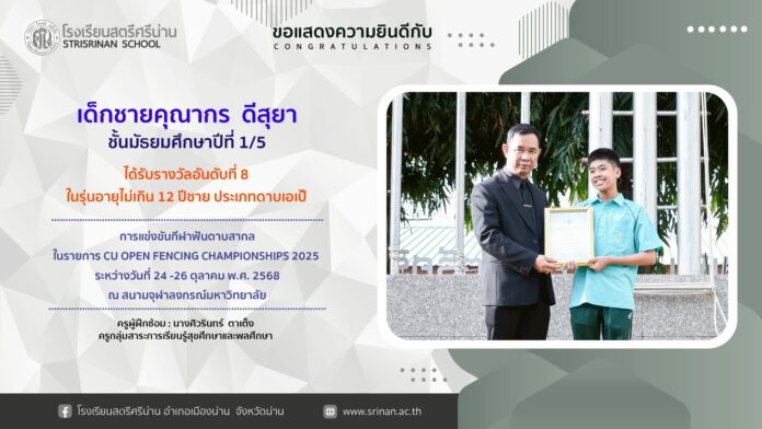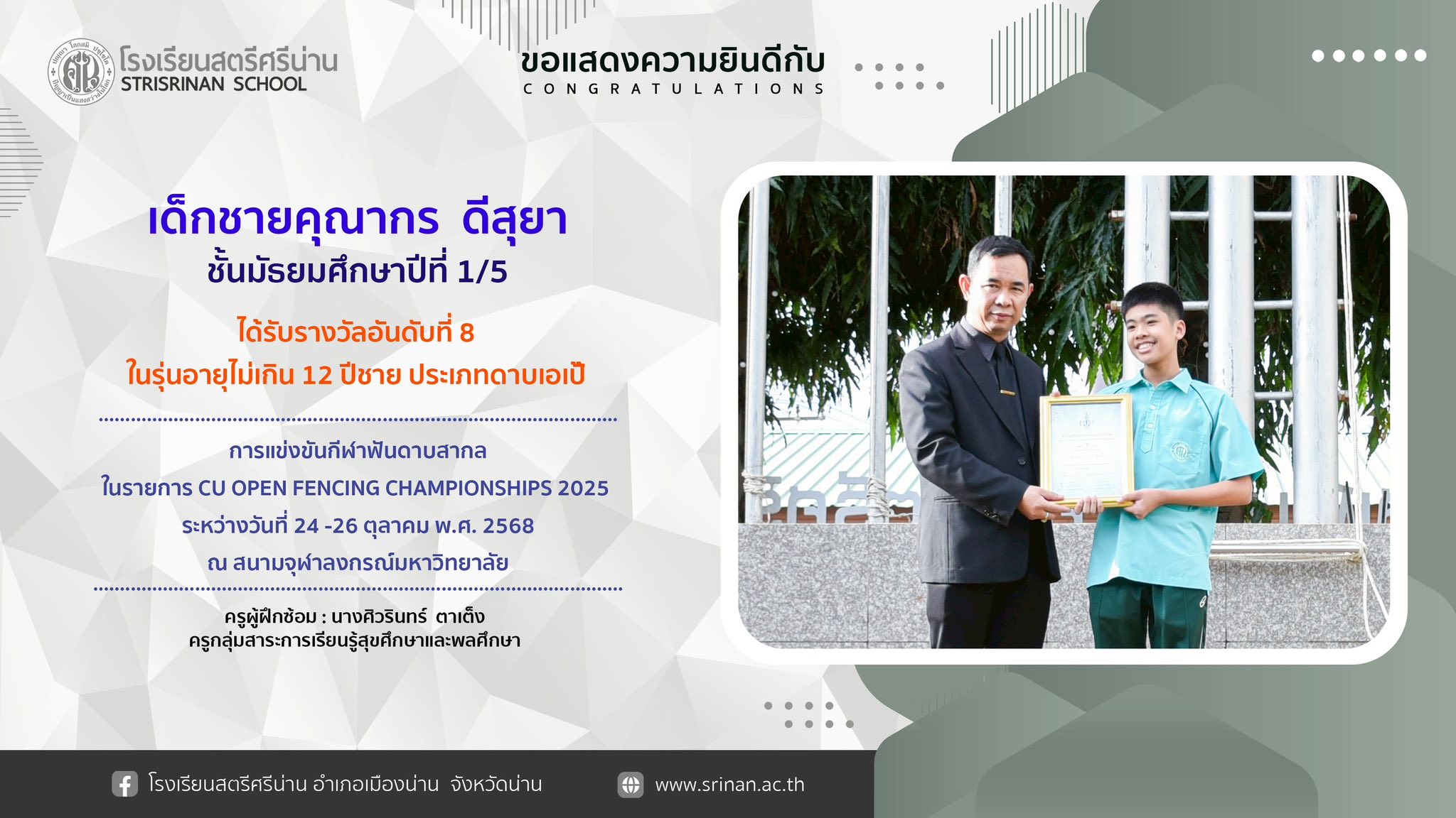 ขอแสดงความยินดีกับนักเรียนที่ได้รับรางวัลการแข่งขันกีฬาฟันดาบสากล ในรายการ CU OPEN FENCING CHAMPIONSHIPS 2025 ระหว่างวันที่ 24 -26 ตุลาคม พ.ศ. 2568 ณ สนามจุฬาลงกรณ์มหาวิทยาลัย
