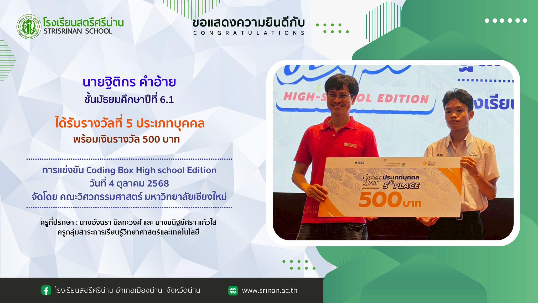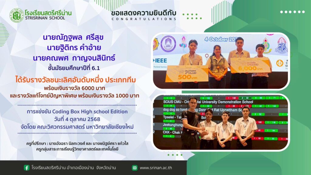 ลานคนดี เวทีคนเก่ง ขอแสดงความยินดีกับนักเรียนที่ได้รับรางวัลการแข่งขัน Coding Box High school Edition วันที่ 4 ตุลาคม 2568 จัดโดย คณะวิศวกรรมศาสตร์ มหาวิทยาลัยเชียงใหม่ By Admin - 7 October 2025 ขอแสดงความยินดีกับนักเรียนที่ได้รับรางวัลการแข่งขัน Coding Box High school Edition วันที่ 4 ตุลาคม 2568 จัดโดย คณะวิศวกรรมศาสตร์ มหาวิทยาลัยเชียงใหม่