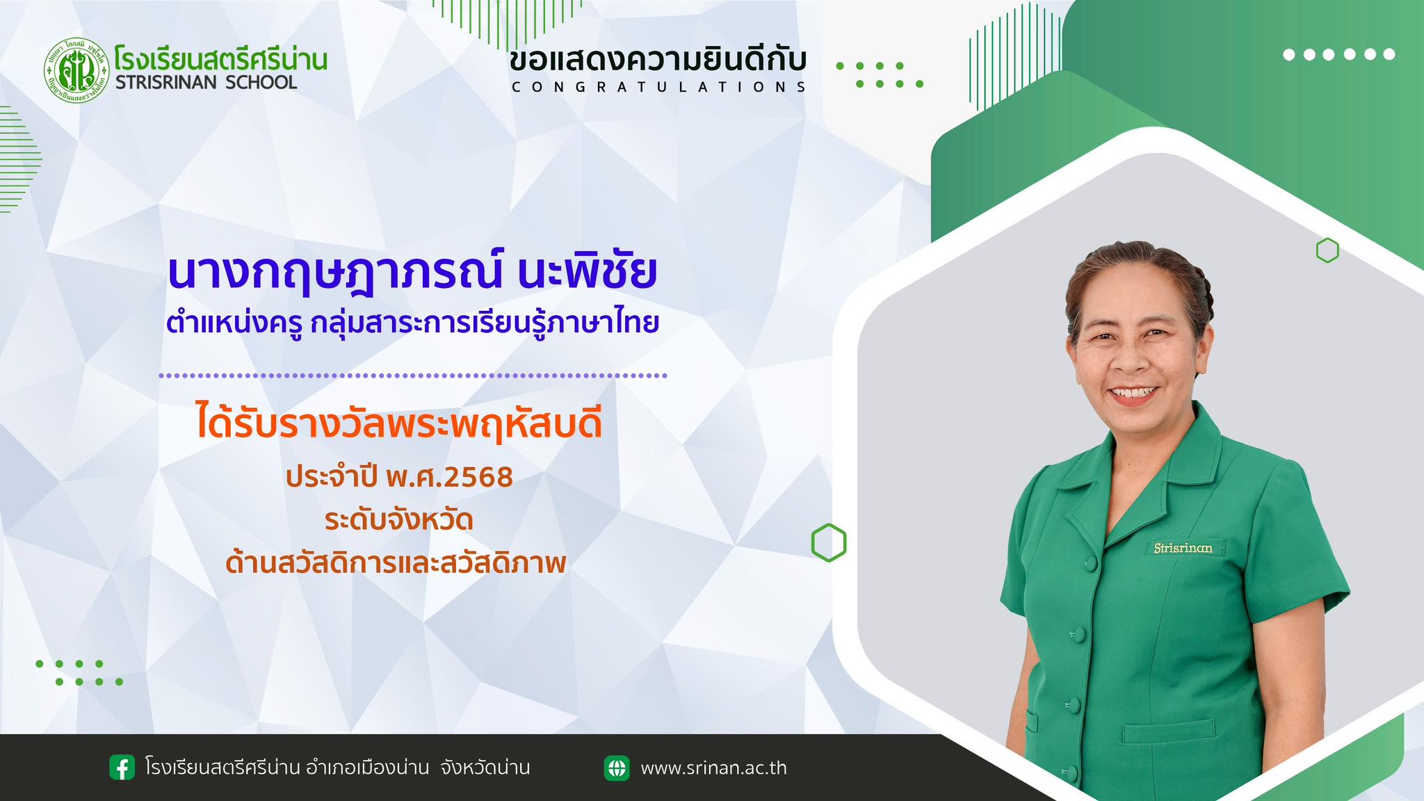 ขอแสดงความยินดีกับ นางกฤษฎาภรณ์ นะพิชัย ตำแหน่งครู กลุ่มสาระการเรียนรู้ภาษาไทย ได้รับรางวัลพระพฤหัสบดี ประจำปี พ.ศ.2568 ระดับจังหวัดด้านสวัสดิการและสวัสดิภาพ