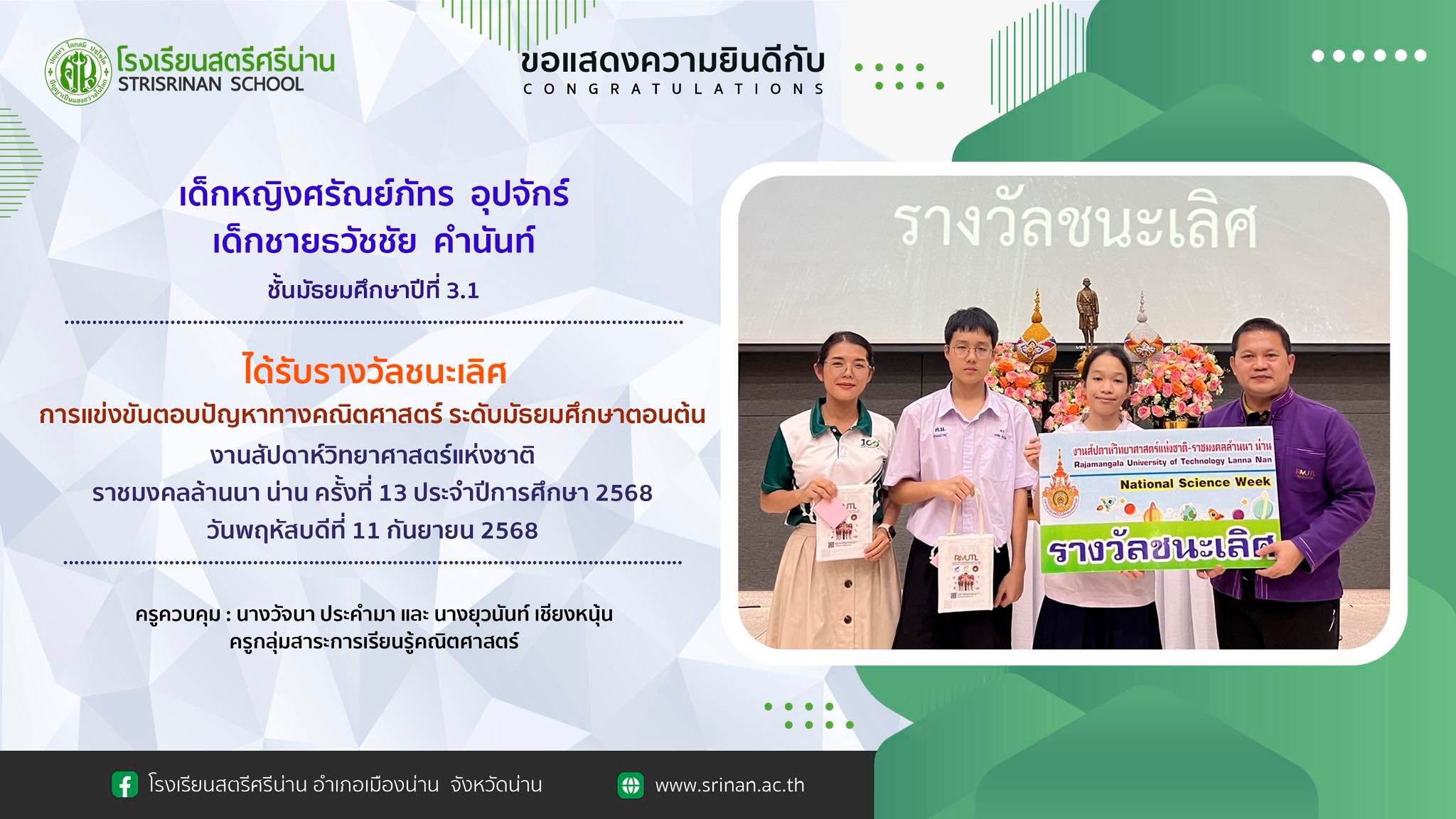 ขอแสดงความยินดีกับนักเรียนที่ได้รางวัลชนะเลิศ การแข่งขันตอบปัญหาทางคณิตศาสตร์ ระดับมัธยมศึกษาตอนต้น งานสัปดาห์วิทยาศาสตร์แห่งชาติราชมงคลล้านนา น่าน ครั้งที่ 13 ประจำปีการศึกษา 2568 วันพฤหัสบดีที่ 11 กันยายน 2568