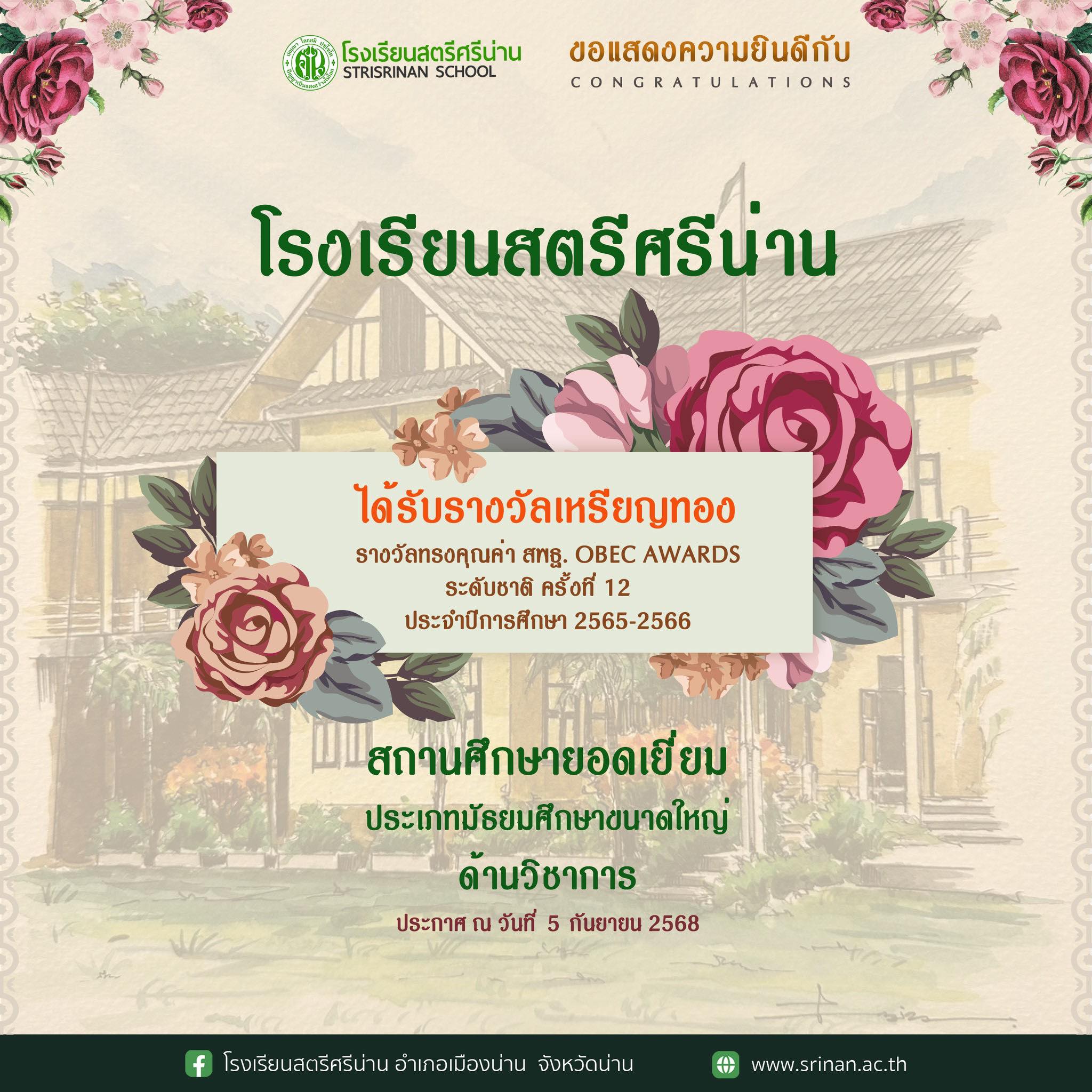 โรงเรียนสตรีศรีน่าน อำเภอเมืองน่าน จังหวัดน่าน ได้รับรางวัลเหรียญทอง รางวัลทรงคุณค่า OBEC AWARDS ระดับชาติ ครั้งที่ 12 ประจำปีการศึกษา 2565-2566