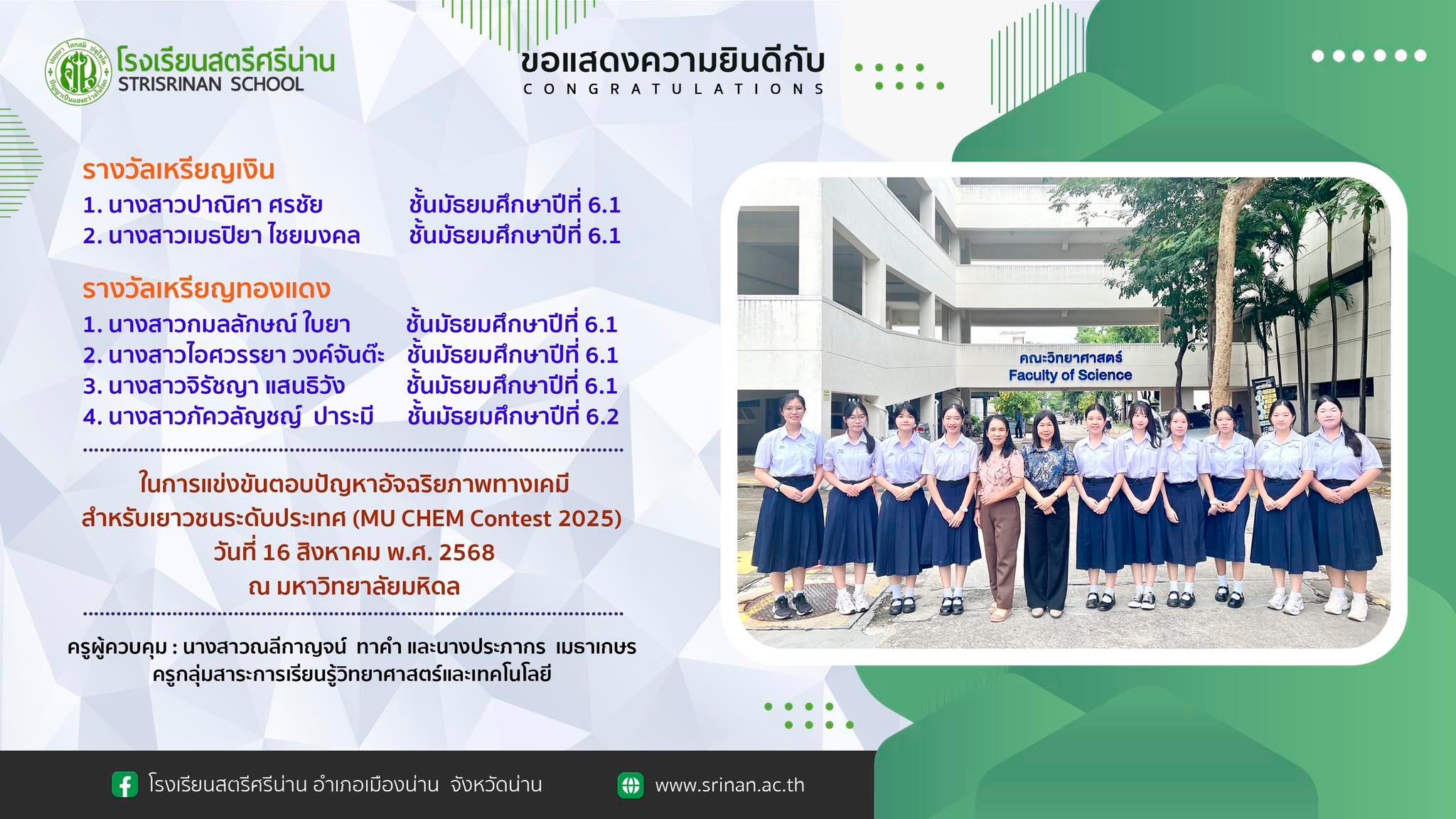 ขอแสดงความยินดีกับนักเรียนที่ได้รับรางวัล ในการแข่งขันตอบปัญหาอัจฉริยภาพทางเคมี สำหรับเยาวชนระดับประเทศ (MU CHEM Contest 2025) วันที่ 16 สิงหาคม พ.ศ. 2568 ณ มหาวิทยาลัยมหิดล