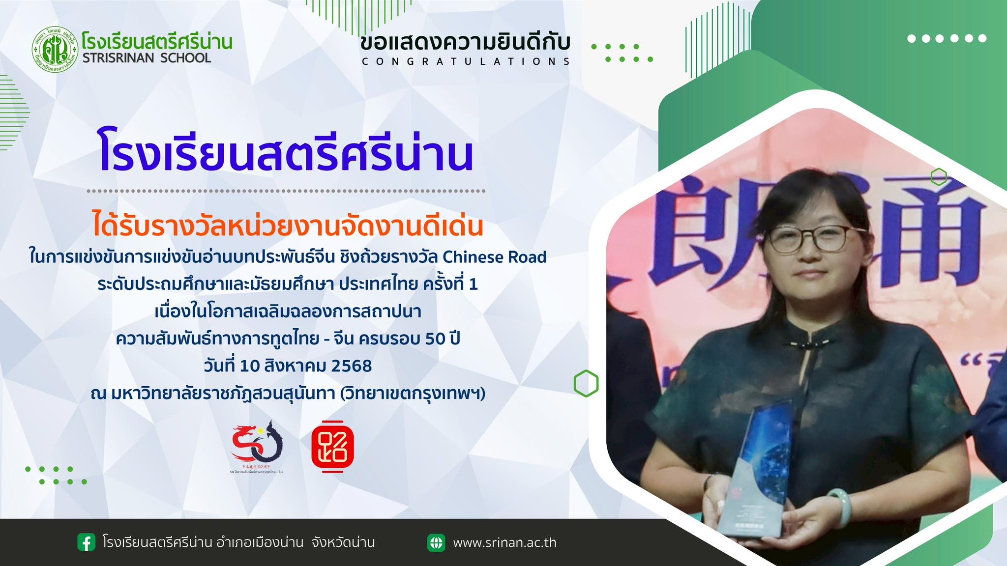 โรงเรียนสตรีศรีน่าน ได้รับรางวัลหน่วยงานจัดงานดีเด่นในการแข่งขันการแข่งขันอ่านบทประพันธ์จีน ชิงถ้วยรางวัล Chinese Road ระดับประถมศึกษาและมัรยบศึกษา ประเทศไทย ครั้งที่ 1 เนื่องในโอกาสเฉลิมฉลองการสถาปนาความสัมพันธ์ทางการทูตไทย – จีน ครบรอบ 50 ปี วันที่ 10 สิงหาคม 2568 ณ มหาวิทยาลัยราชภัฎสวนสุนันทา (วิทยาเขตกรุงเทพฯ)