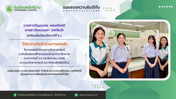 Home ลานคนดี เวทีคนเก่ง ขอแสดงความยินดีกับนักเรียนที่ได้รับรางวัลเข้าร่วมการแข่งขันในการแข่งขันโครงงานวิทยาศาสตร์ ระดับชั้นมัธยมศึกษาตอนปลาย สาขาชีวภาพ ระหว่างวันที่ 13-16 สิงหาคม 2568 ณ คณะวิทยาศาสตร์ มหาวิทยาลัยเชียงใหม่