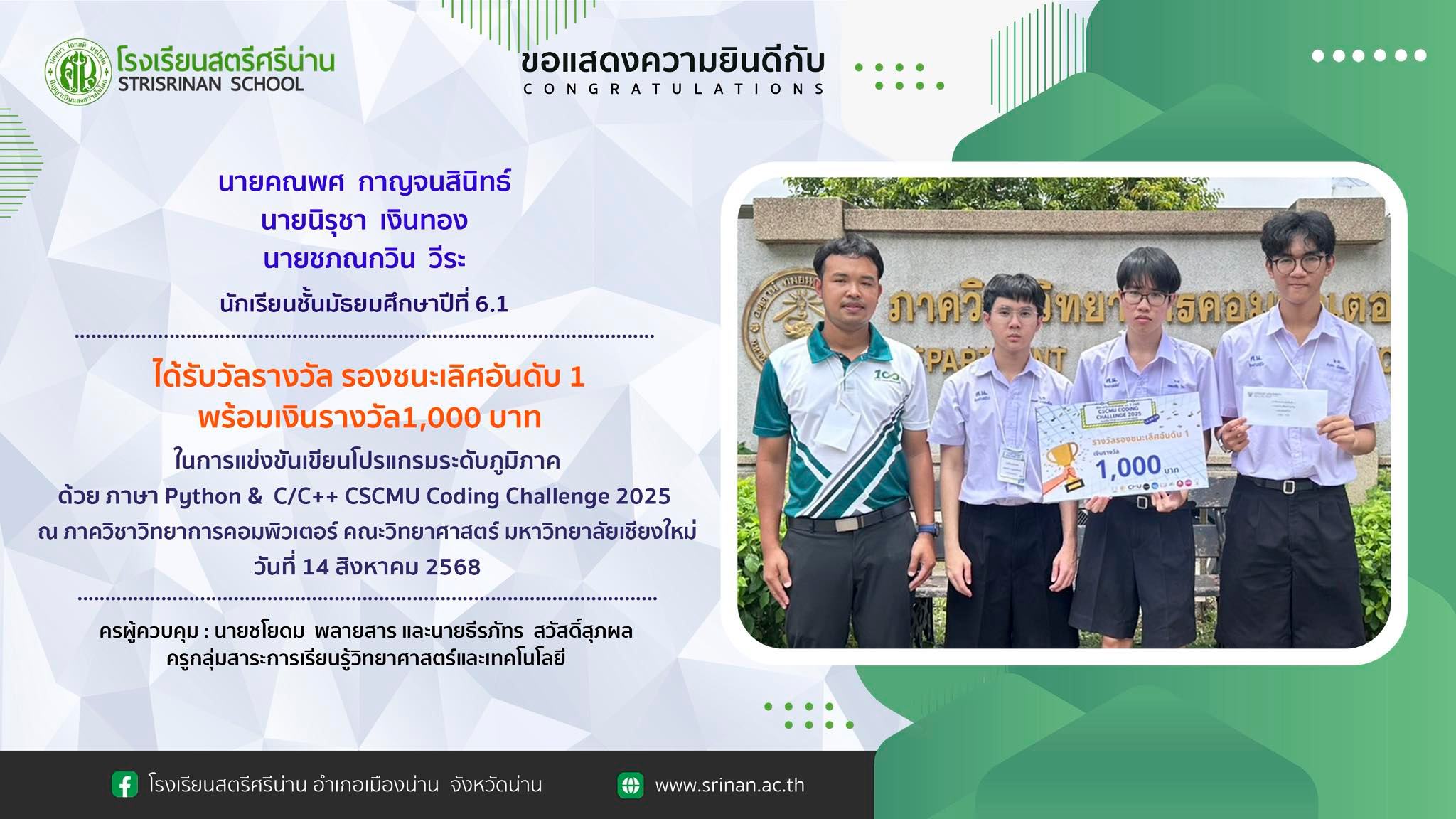 ขอแสดงความยินดีกับนักเรียนที่ได้รับวัลรางวัล รองชนะเลิศอันดับ 1 พร้อมเงินรางวัล 1,000 บาท ในการแข่งขันเขียนโปรแกรมระดับภูมิภาค ด้วยภาษา Python & C/C++ CSCMU Coding Challenge 2025 ณ ภาควิชาวิทยาการคอมพิวเตอร์ คณะวิทยาศาสตร์ มหาวิทยาลัยเชียงใหม่วันที่ 14 สิงหาคม 2568