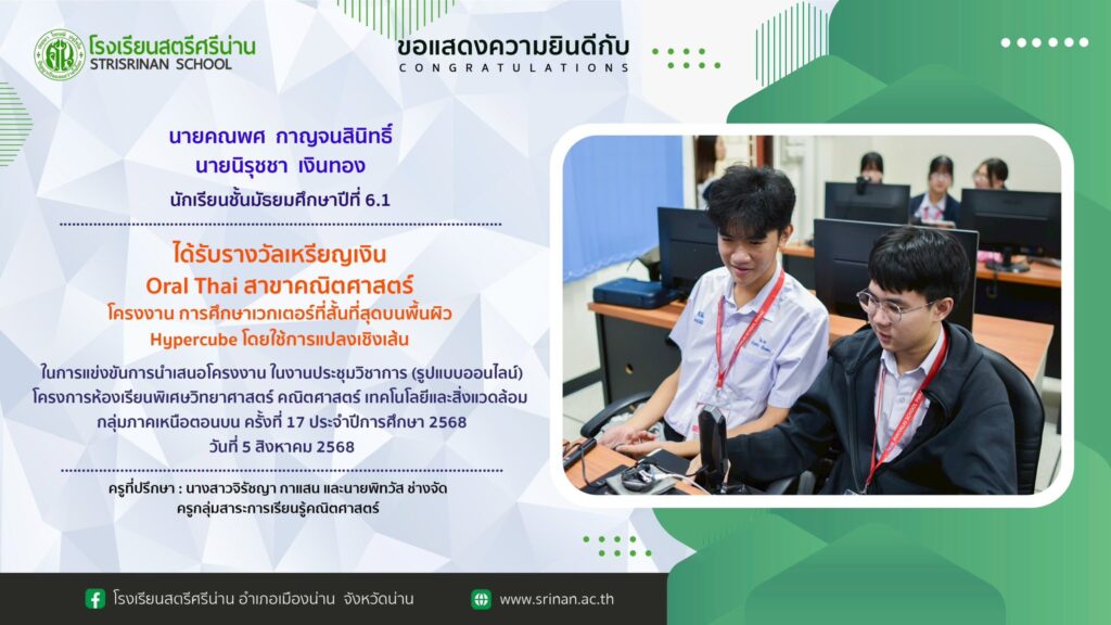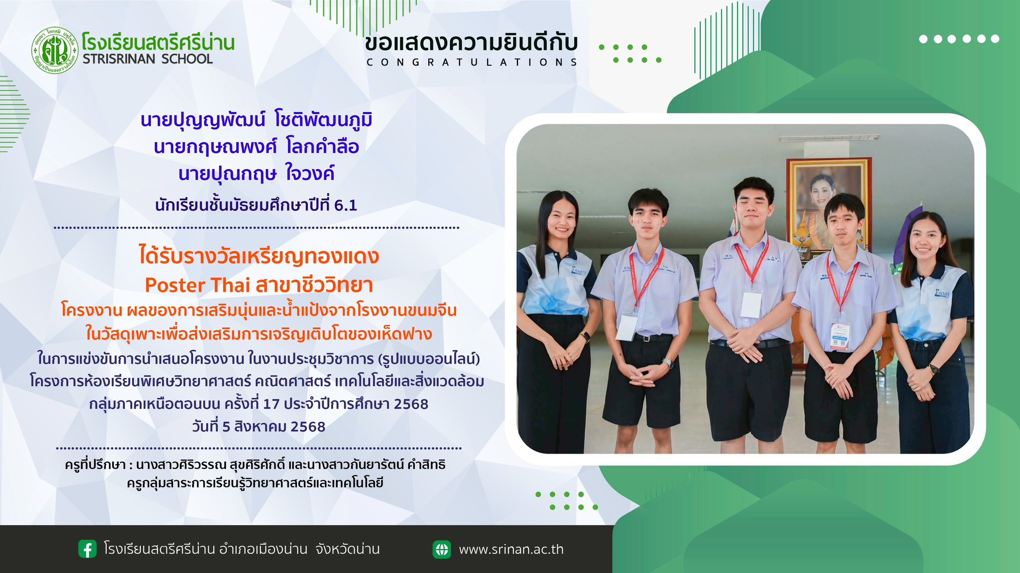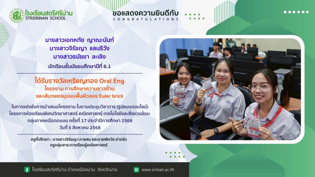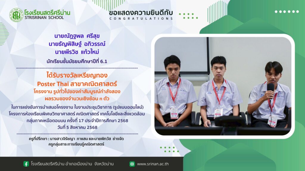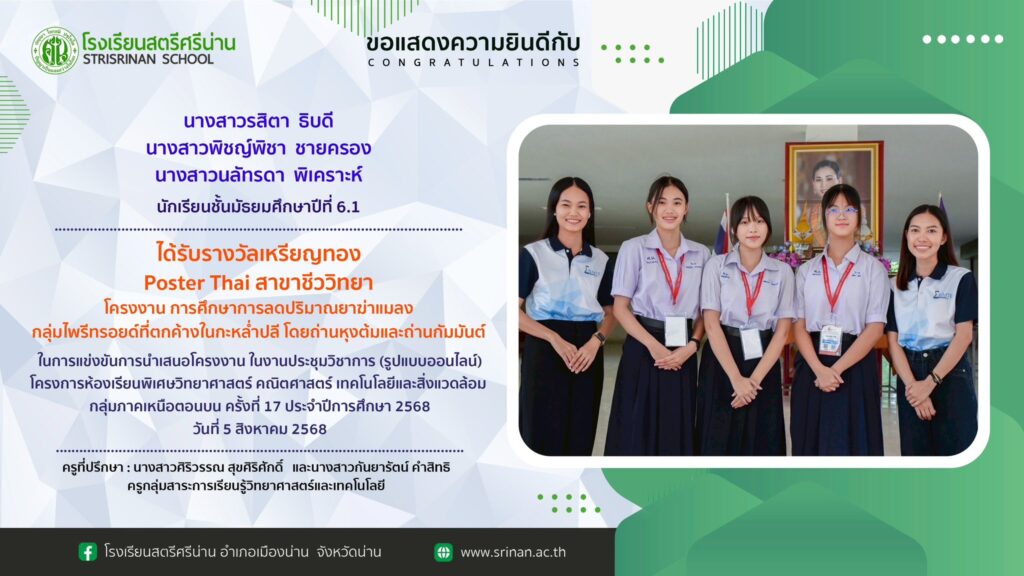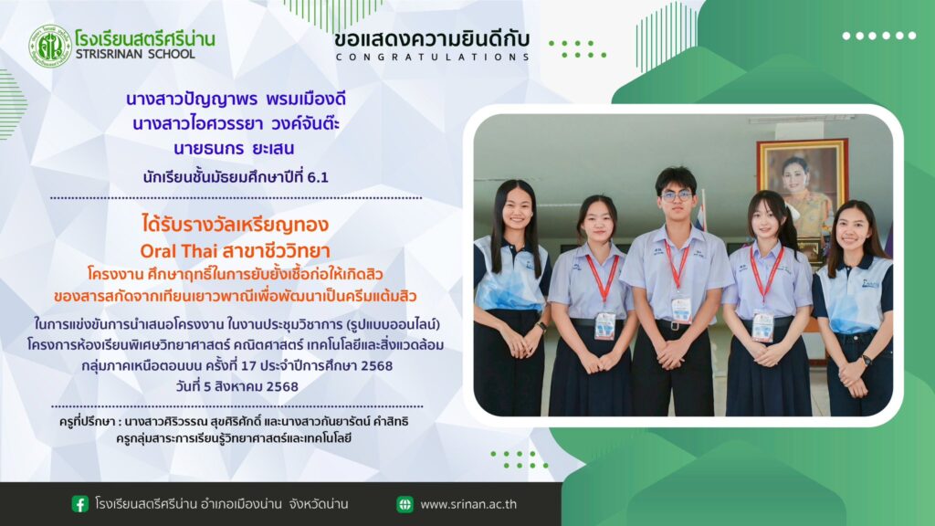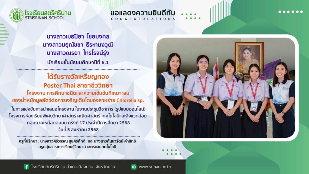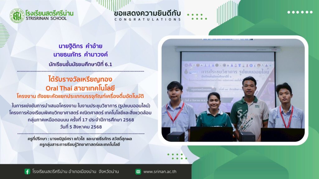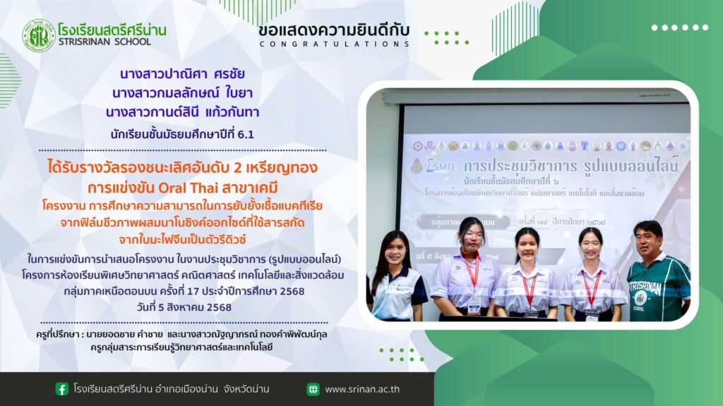 ขอแสดงความยินดีกับนักเรียนและครู ที่ได้รับรางวัลจากการแข่งขันการนำเสนอโครงงาน ในการประชุมวิชาการ (รูปแบบออนไลน์) โครงการห้องเรียนพิเศษวิทยาศาสตร์ คณิตศาสตร์ เทคโนโลยีและสิ่งแวดล้อม กลุ่มภาคเหนือตอนบน ครั้งที่ 17 ประจำปีการศึกษา 2568 วันที่ 5 สิงหาคม พ.ศ.2568