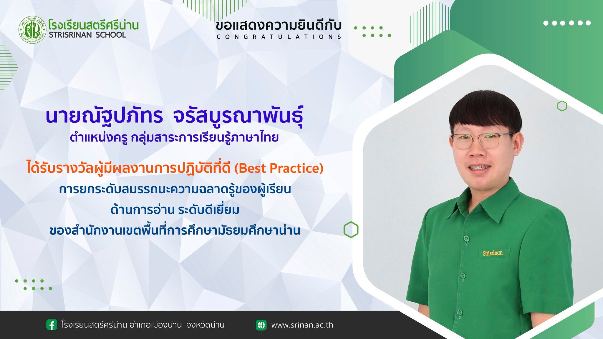 ลานคนดี เวทีคนเก่ง ขอแสดงความยินดีกับคณะครูที่ได้รับรางวัลผู้มีผลงานการปฏิบัติที่ดี (Best Practice) การยกระดับสมรรถนะความฉลาดรู้ของผู้เรียน ระดับดีเยี่ยม ของสำนักงานเขตพื้นที่การศึกษามัธยมศึกษาน่าน By Admin - 21 July 2025 ขอแสดงความยินดีกับคณะครูที่ได้รับรางวัลผู้มีผลงานการปฏิบัติที่ดี (Best Practice) การยกระดับสมรรถนะความฉลาดรู้ของผู้เรียน ระดับดีเยี่ยม ของสำนักงานเขตพื้นที่การศึกษามัธยมศึกษาน่าน