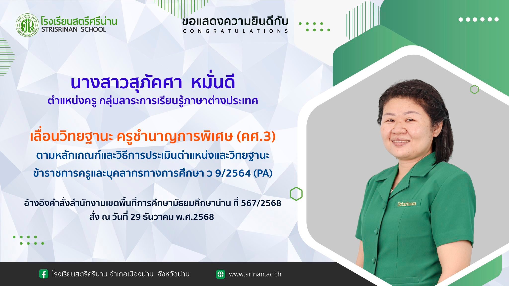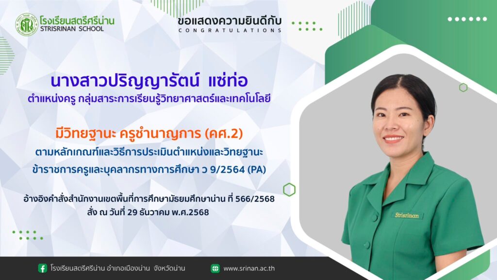 ลานคนดี เวทีคนเก่ง ขอแสดงความยินดีกับครู ที่ได้เลื่อนวิทยฐานะเป็น ครูชำนาญการพิเศษ และมีวิทยฐานะ ครูชำนาญการ By Admin - 7 January 2026 โรงเรียนสตรีศรีน่าน ขอแสดงความยินดีกับครู ที่ได้เลื่อนวิทยฐานะเป็น ครูชำนาญการพิเศษ และมีวิทยฐานะ ครูชำนาญการ