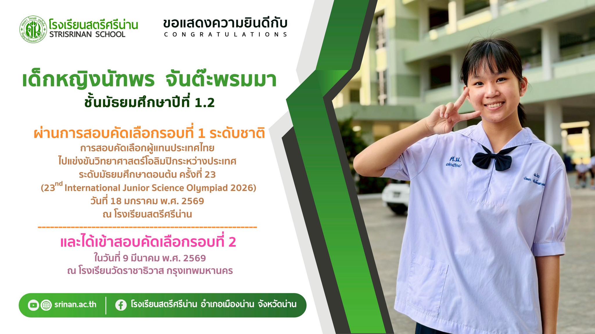 โรงเรียนสตรีศรีน่าน ขอแสดงความยินดีกับ เด็กหญิงนัฑพร จันต๊ะพรมมา ชั้นมัธยมศึกษาปีที่ 1.2 ผ่านการสอบคัดเลือกรอบที่ 1 ระดับชาติ การสอบคัดเลือกผู้แทนประเทศไทย ไปแข่งขันวิทยาศาสตร์โอลิมปิกระหว่างประเทศ