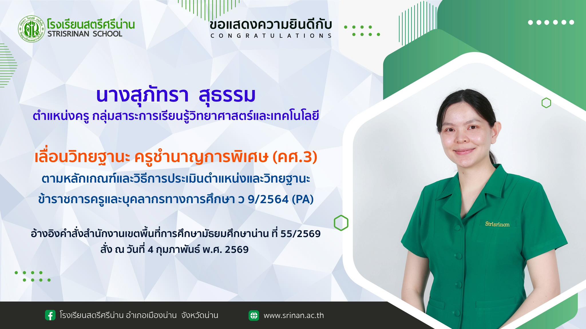 โรงเรียนสตรีศรีน่าน ขอแสดงความยินดีกับ นางสุภัทรา สุธรรม ตำแหน่งครู กลุ่มสาระการเรียนรู้วิทยาศาสตร์และเทคโนโลยี เลื่อนวิทยฐานะ ครูชำนาญการพิเศษ (คศ.3) ตามหลักเกณฑ์และวิธีการประเมินตำแหน่งและวิทยฐานะ