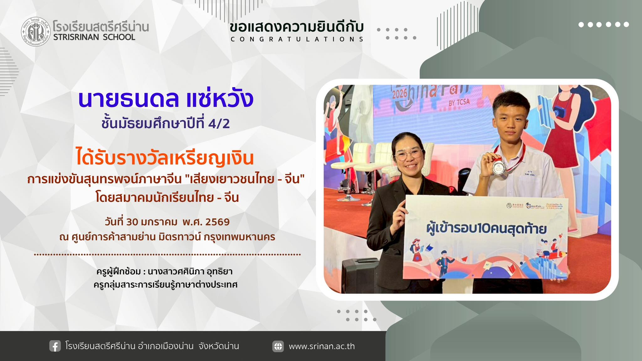 โรงเรียนสตรีศรีน่าน ขอแสดงความยินดีกับ นายธนดล แซ่หวัง ชั้นมัธยมศึกษาปีที่ 4/2 ได้รับรางวัลเหรียญเงิน การแข่งขันสุนทรพจน์ภาษาจีน “เสียงเยาวชนไทย -จีน” โดยสมาคมนักเรียนไทย – จีน วันที่ 30 มกราคม พ.ศ. 2569 ณ ศูนย์การค้าสามย่าน มิตรทาวน์ กรุงเทพมหานคร