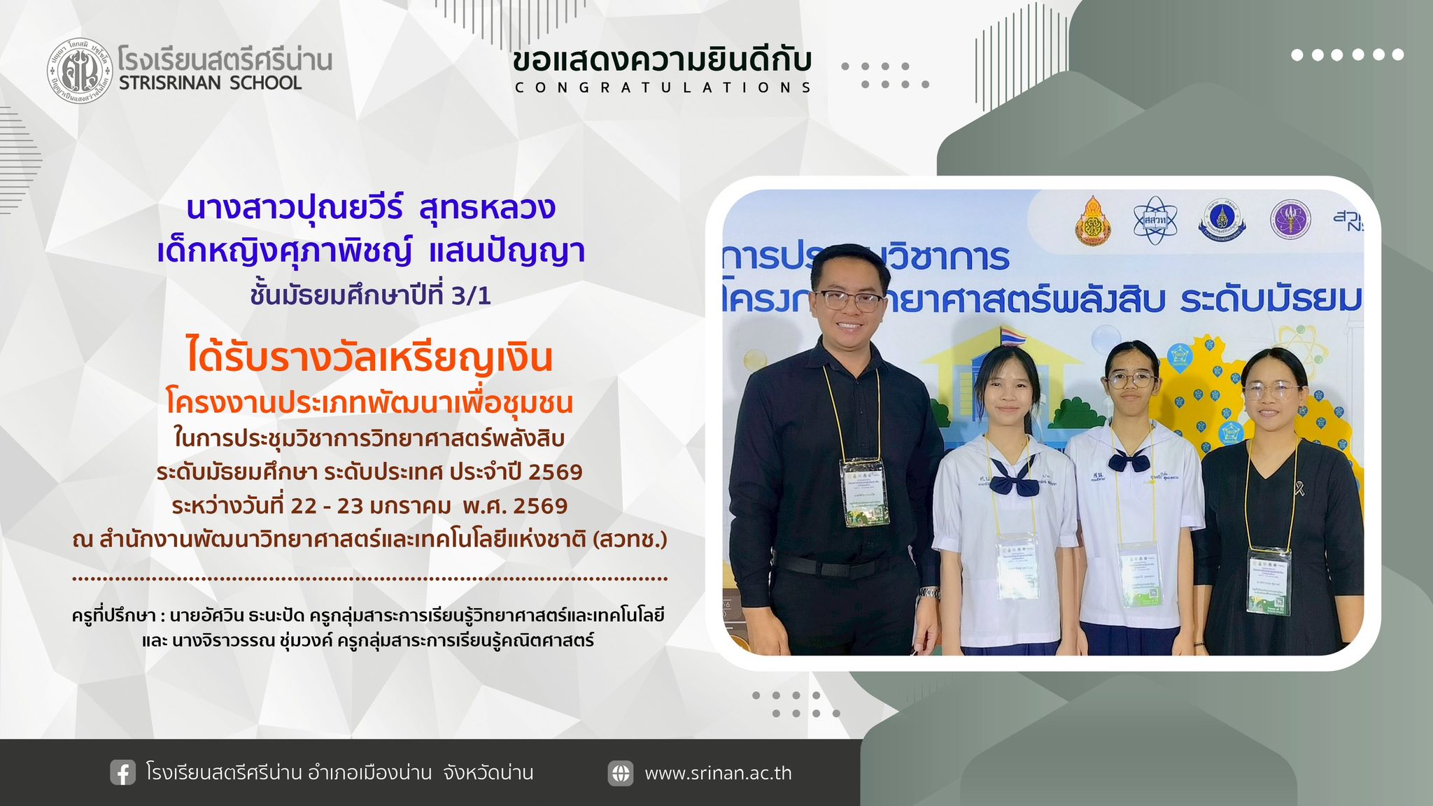 โรงเรียนสตรีศรีน่าน ขอแสดงความยินดีกับนักเรียนที่ได้รับรางวัลในการประชุมวิชาการวิทยาศาสตร์พลังสิบ