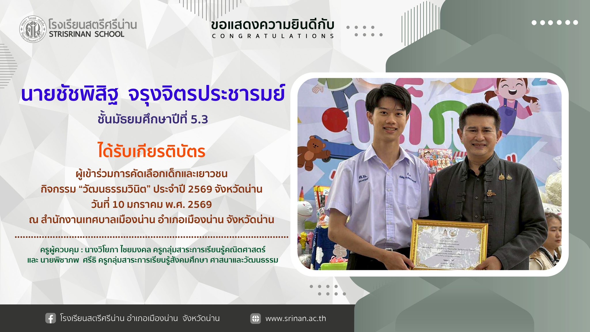 ลานคนดี เวทีคนเก่ง ขอแสดงความยินดีกับนักเรียนที่ได้รับเกียรติบัตร ผู้เข้าร่วมการคัดเลือกเด็กและเยาวชนกิจกรรม “วัฒนธรรมวินิต” ประจำปี 2569 จังหวัดน่าน By Admin - 13 January 2026 โรงเรียนสตรีศรีน่าน ขอแสดงความยินดีกับนักเรียนที่ได้รับเกียรติบัตร ผู้เข้าร่วมการคัดเลือกเด็กและเยาวชนกิจกรรม “วัฒนธรรมวินิต” ประจำปี 2569 จังหวัดน่าน