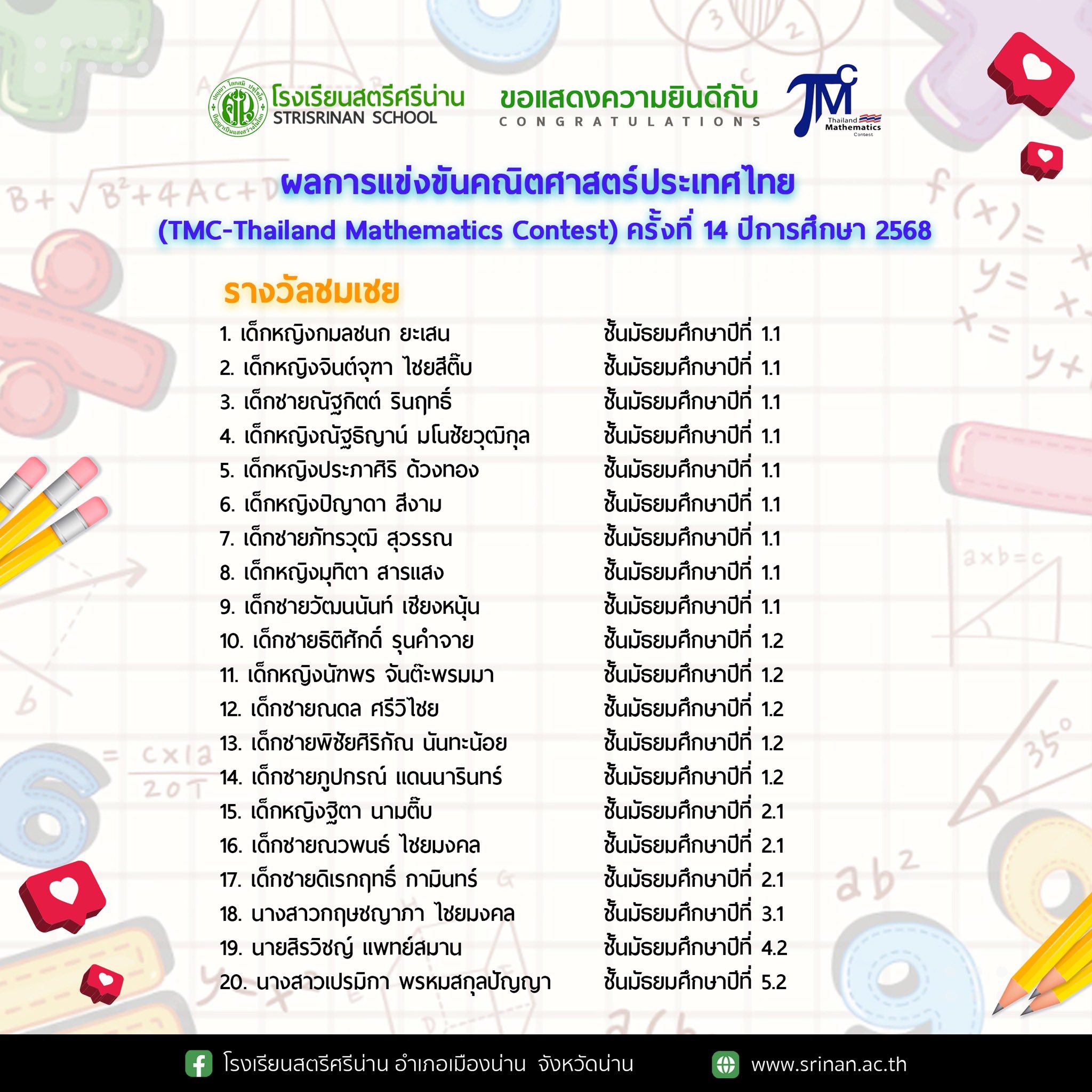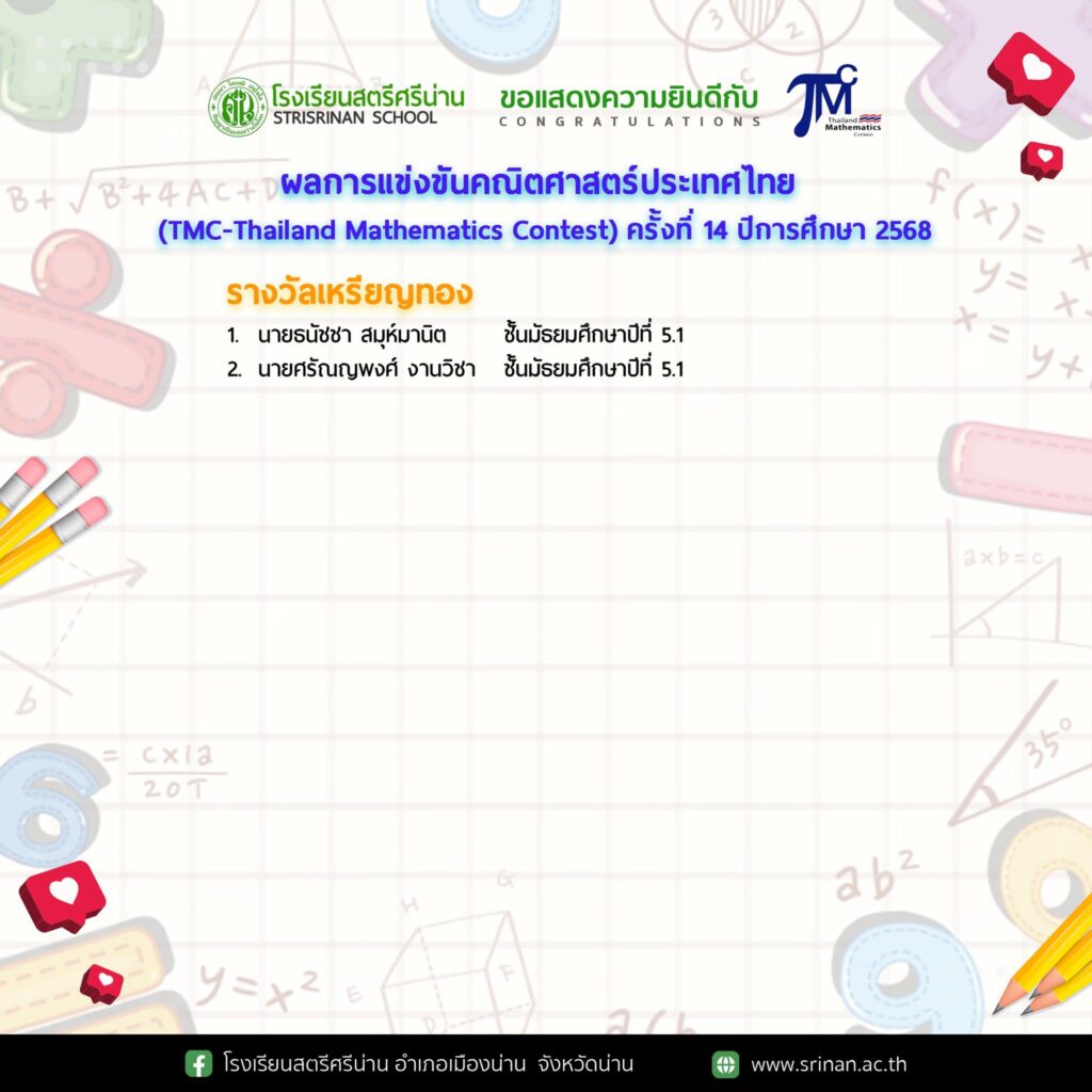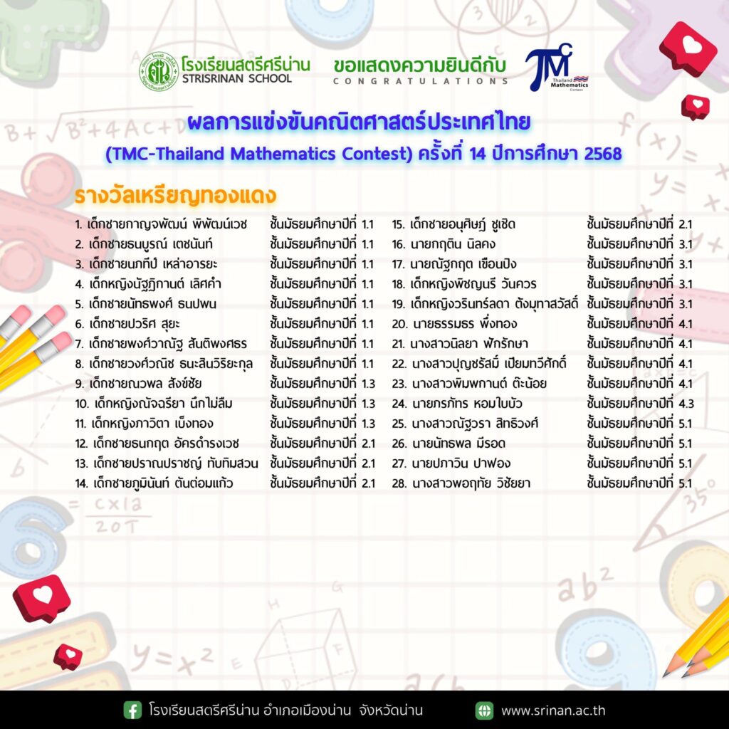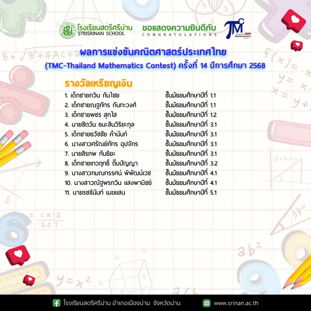 ลานคนดี เวทีคนเก่ง ขอแสดงความยินดีกับนักเรียนที่ได้รับรางวัล จากแข่งขันคณิตศาสตร์ประเทศไทย (Thailand Mathematics Contest) ครั้งที่ 14 ปีการศึกษา 2568 By Admin - 1 April 2026 โรงเรียนสตรีศรีน่าน ขอแสดงความยินดีกับนักเรียนที่ได้รับรางวัล จากแข่งขันคณิตศาสตร์ประเทศไทย (Thailand Mathematics Contest) ครั้งที่ 14 ปีการศึกษา 2568 รวม 61 คน ดังนี้ เหรียญทอง 2 คน เหรียญเงิน 11 คน เหรียญทองแดง 28 คน รางวัลชมเชย 20 คน
