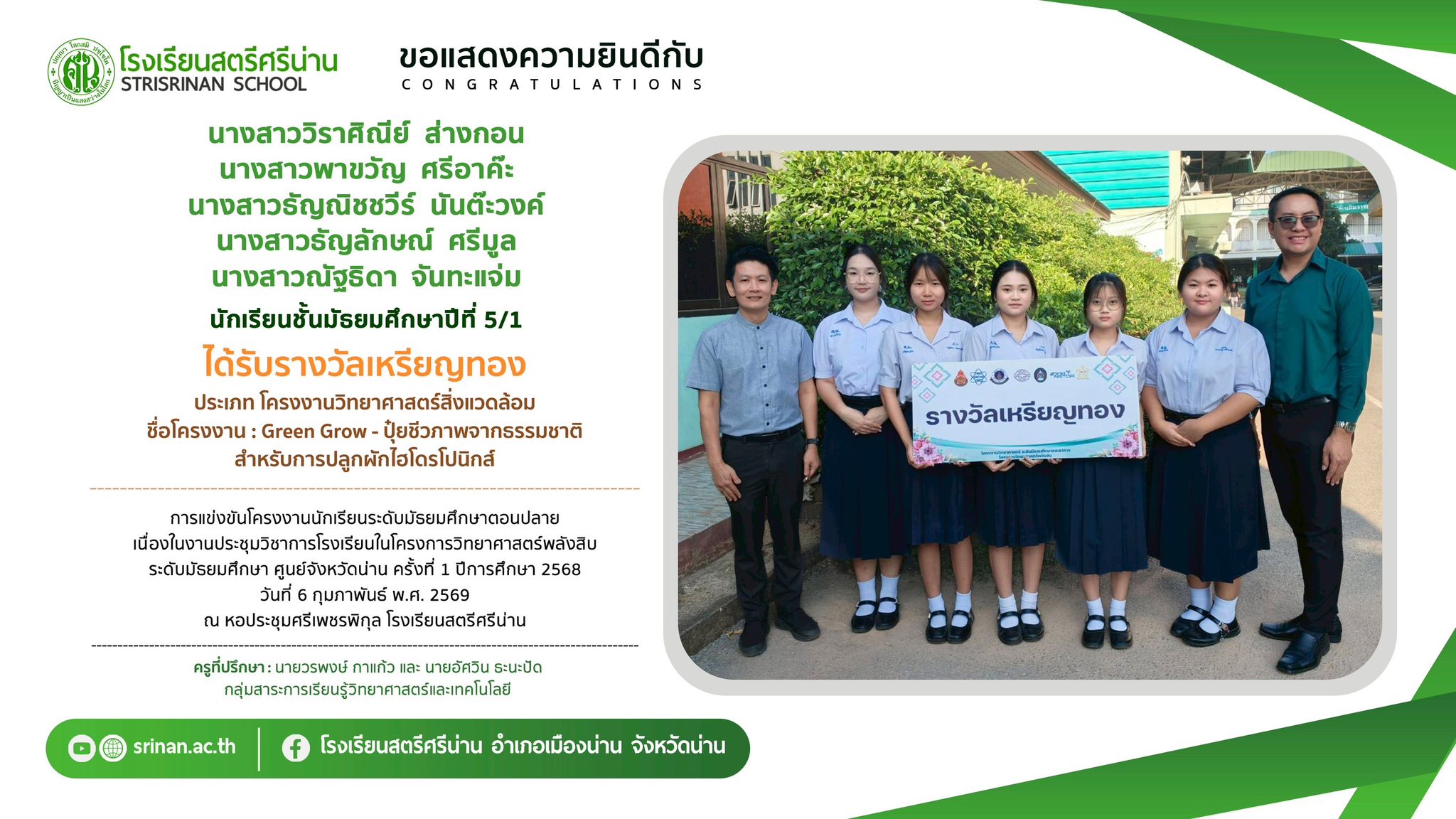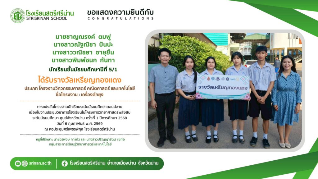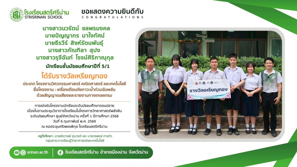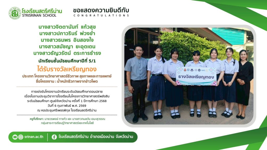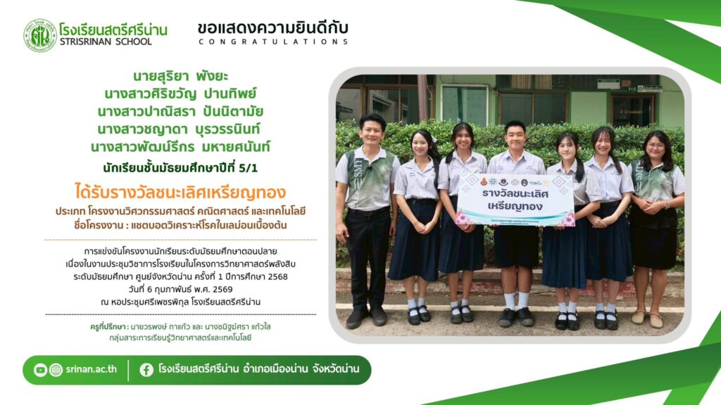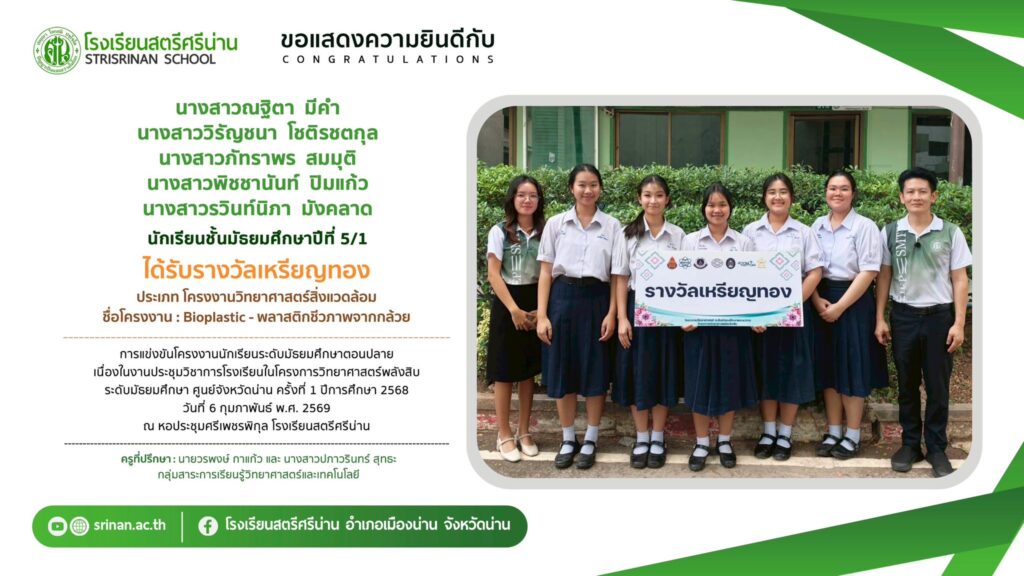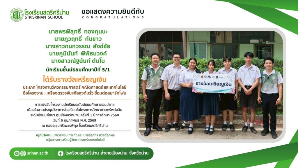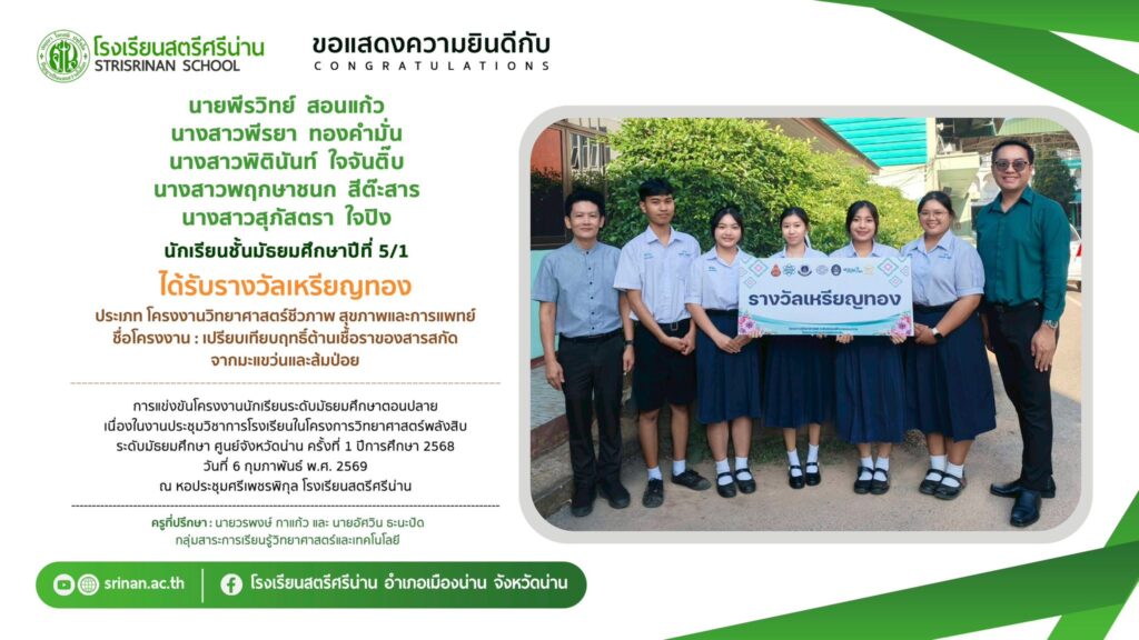 ลานคนดี เวทีคนเก่ง ขอแสดงความยินดีกับนักเรียนที่ได้รับรางวัลจากการแข่งขันโครงงานนักเรียนระดับมัธยมศึกษาตอนปลาย เนื่องในงานประชุมวิชาการโรงเรียนในโครงการวิทยาศาสตร์พลังสิบ ระดับมัธยมศึกษา ศูนย์จังหวัดน่าน ครั้งที่ 1 ปีการศึกษา 2568 By Admin - 26 February 2026 โรงเรียนสตรีศรีน่าน ขอแสดงความยินดีกับนักเรียนที่ได้รับรางวัลจากการแข่งขันโครงงานนักเรียนระดับมัธยมศึกษาตอนปลาย เนื่องในงานประชุมวิชาการโรงเรียนในโครงการวิทยาศาสตร์พลังสิบ ระดับมัธยมศึกษา ศูนย์จังหวัดน่าน ครั้งที่ 1 ปีการศึกษา 2568