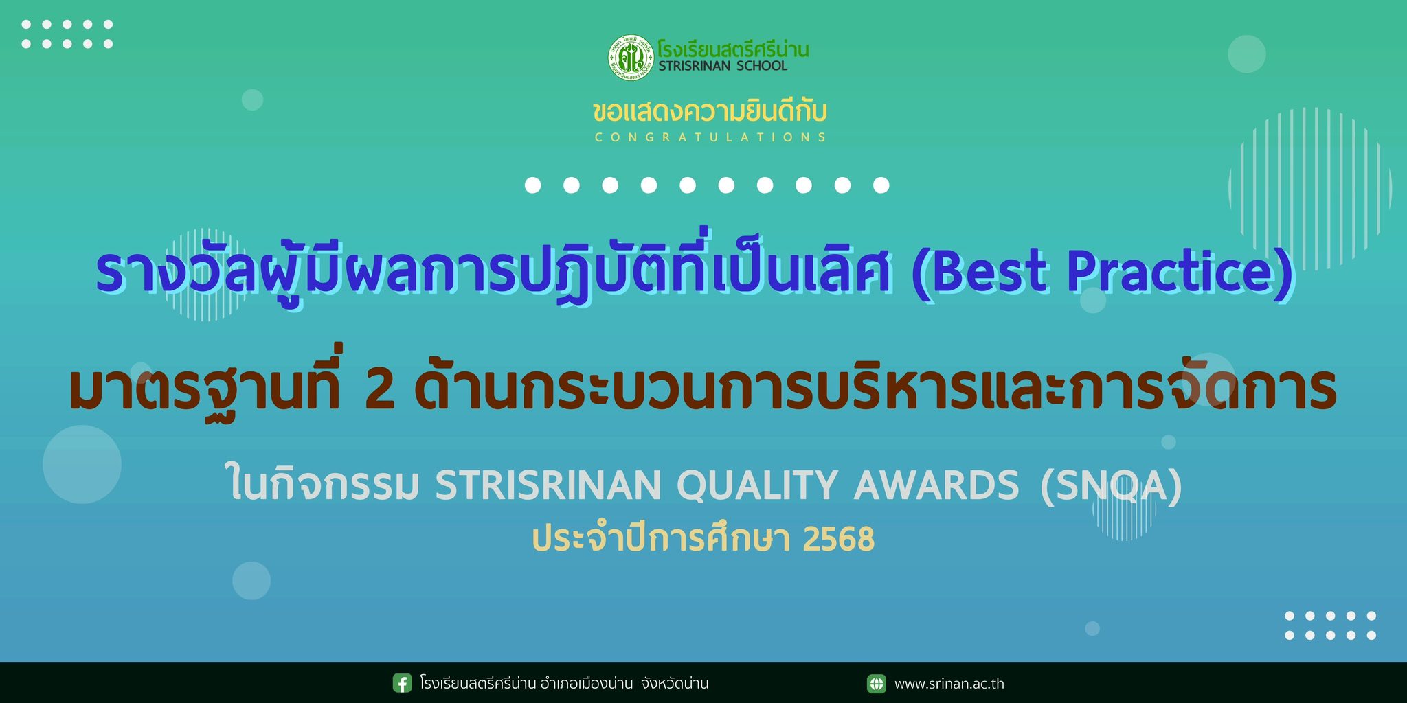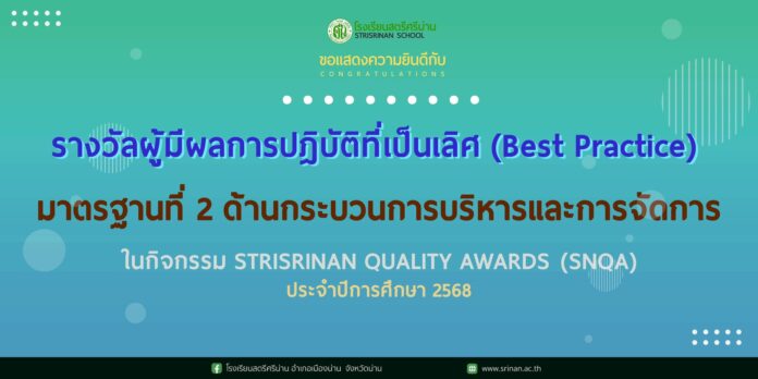 ลานคนดี เวทีคนเก่ง ขอแสดงความยินดีกับผู้ที่ได้รับรางวัล ผู้มีผลการปฏิบัติที่เป็นเลิศ (Best Practice) มาตรฐานที่ 2 ด้านกระบวนการบริหารและการจัดการ ในกิจกรรม STRISRINAN QUALITY AWARDS ปีการศึกษา 2568 By Admin - 26 February 2026 โรงเรียนสตรีศรีน่าน ขอแสดงความยินดีกับผู้ที่ได้รับรางวัล ผู้มีผลการปฏิบัติที่เป็นเลิศ (Best Practice) มาตรฐานที่ 2 ด้านกระบวนการบริหารและการจัดการ ในกิจกรรม STRISRINAN QUALITY AWARDS ปีการศึกษา 2568