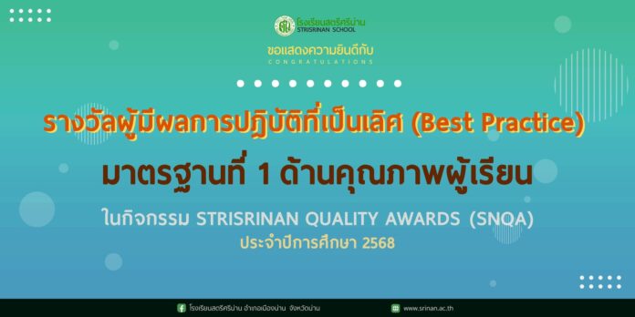 ลานคนดี เวทีคนเก่ง ขอแสดงความยินดีกับผู้ที่ได้รับรางวัล ผู้มีผลการปฏิบัติที่เป็นเลิศ (Best Practice) มาตรฐานที่ 1 ด้านคุณภาพผู้เรียน ในกิจกรรม STRISRINAN QUALITY AWARDS ปีการศึกษา 2568 By Admin - 26 February 2026 โรงเรียนสตรีศรีน่าน ขอแสดงความยินดีกับผู้ที่ได้รับรางวัล ผู้มีผลการปฏิบัติที่เป็นเลิศ (Best Practice) มาตรฐานที่ 1 ด้านคุณภาพผู้เรียน ในกิจกรรม STRISRINAN QUALITY AWARDS ปีการศึกษา 2568