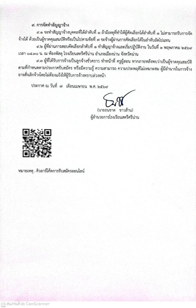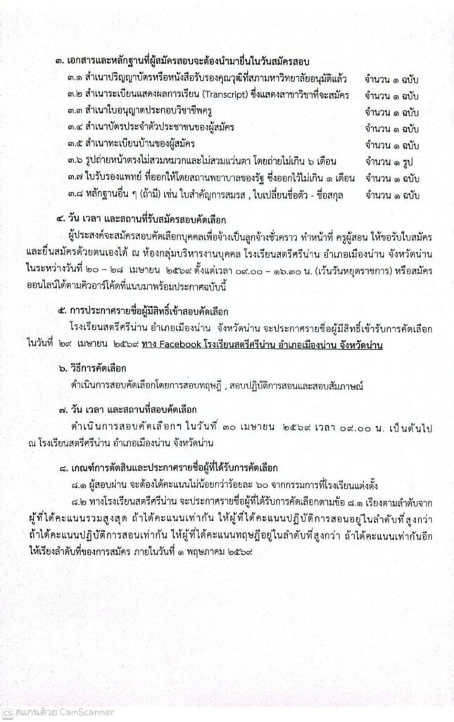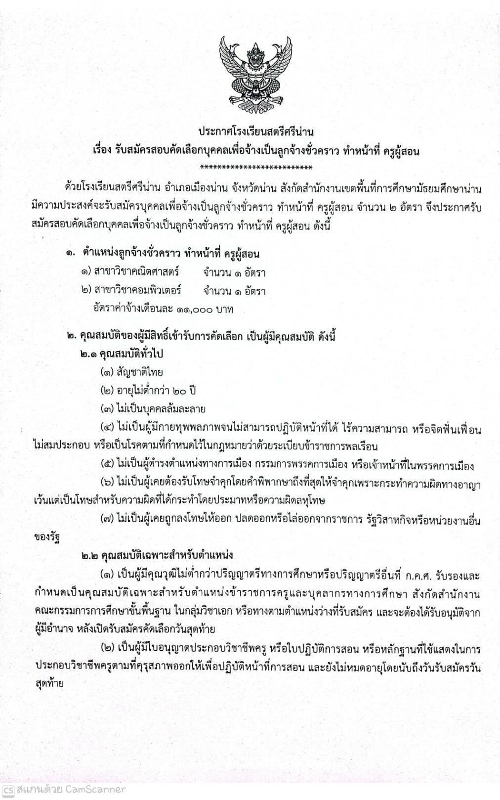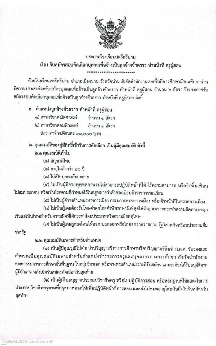 โรงเรียนสตรีศรีน่าน ประกาศรับสมัครสอบคัดเลือกบุคคลเพื่อจ้างเป็นลูกจ้างชั่วคราวทำหน้าที่ครูผู้สอน
