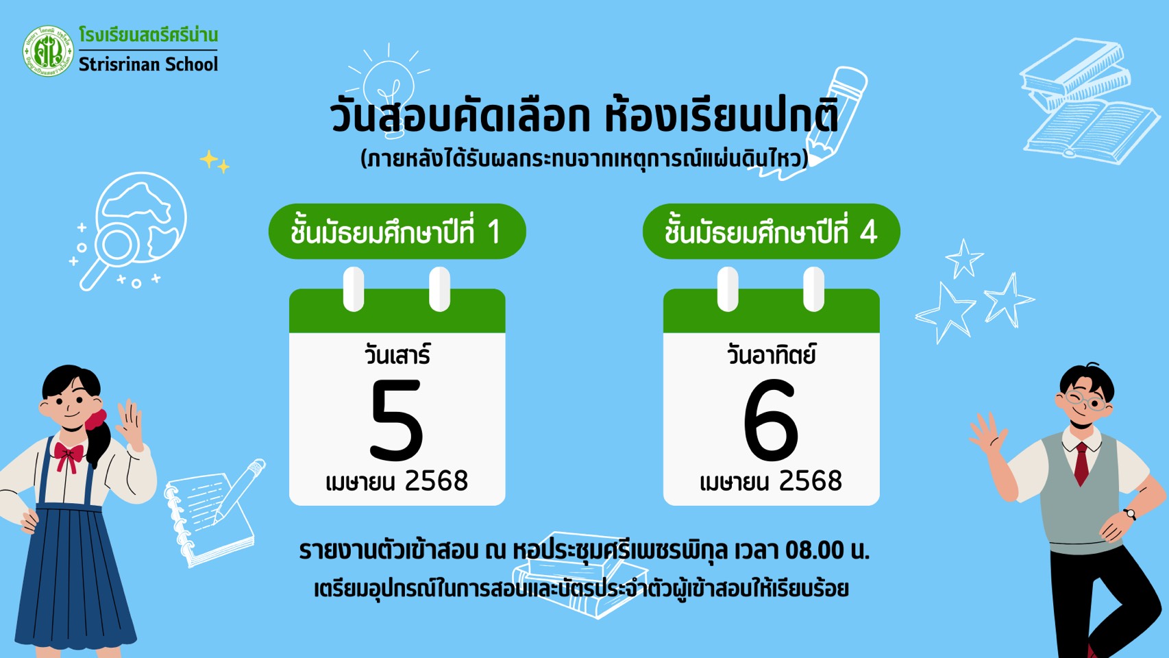 ประกาศ เรื่อง รายชื่อนักเรียนที่มีสิทธิ์สอบคัดเลือกนักเรียนห้องเรียนปกติ ชั้นมัธยมศึกษาปีที่ 1 และ 4 ประจำปีการศึกษา 2569
